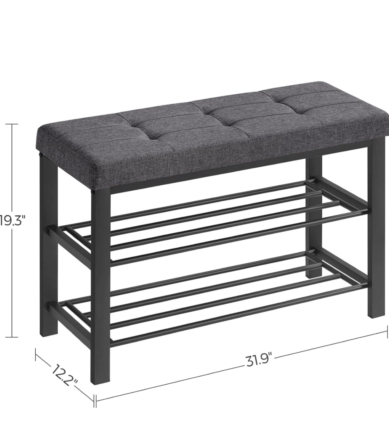 Here's a handy shoe rack bench to keep your entryway organized! It features a comfortable grey cushioned seat and two shelves for storing shoes.