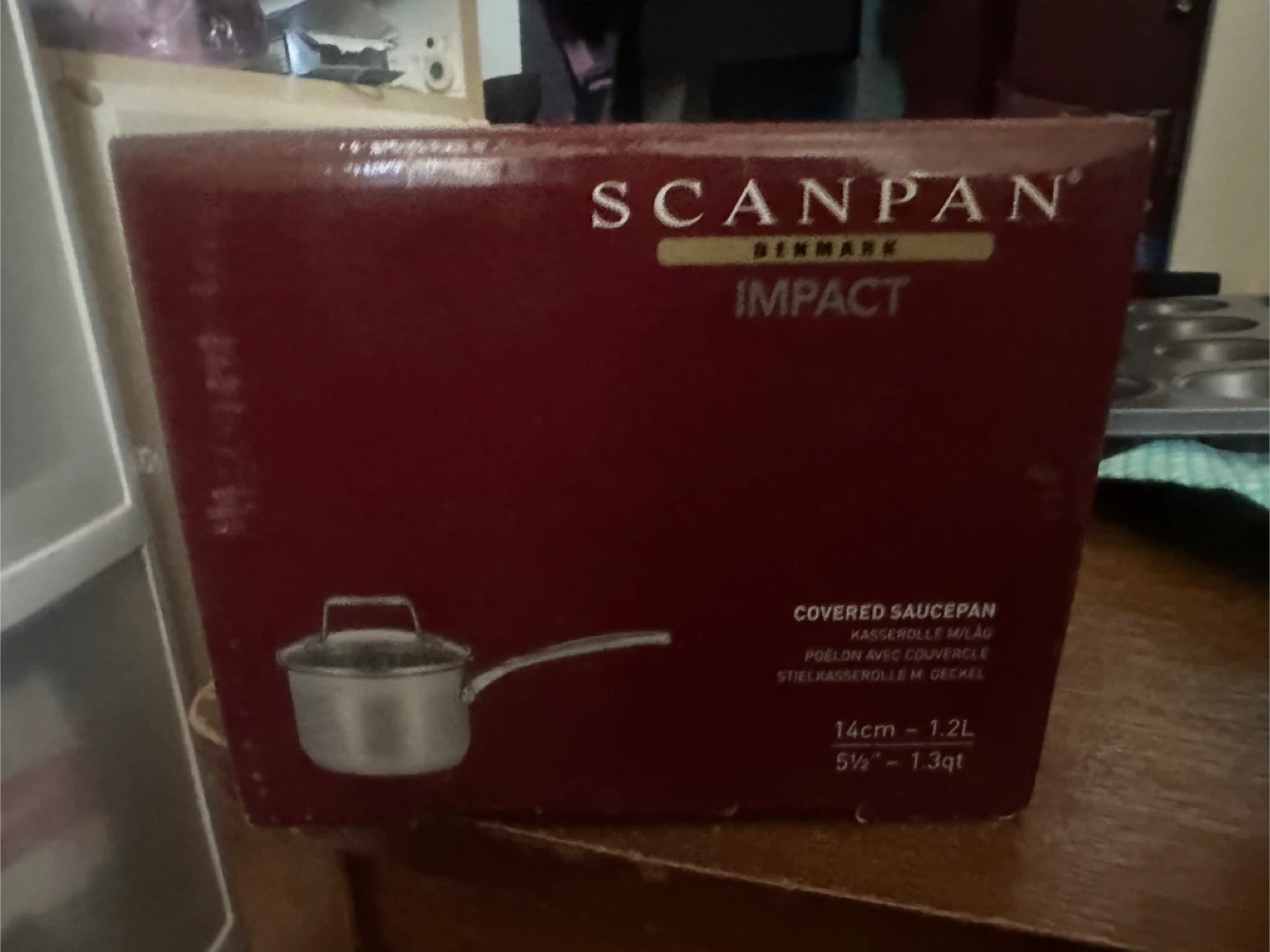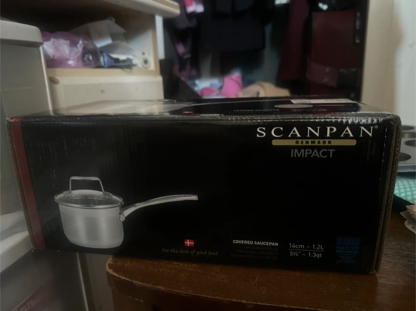 This is a brand new Scanpan Impact 1.2L covered saucepan, renowned for its quality and durability, featuring a stainless steel body and an impact-bonded aluminum base for even heat distribution. It's suitable for all energy sources, including induction.