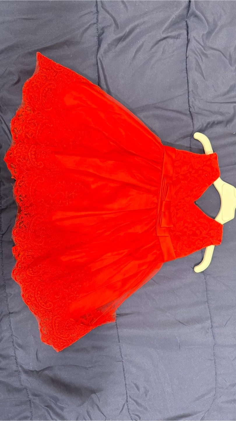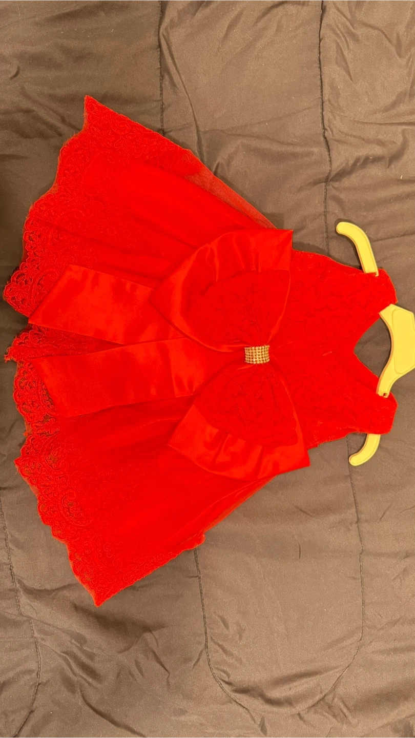 Adorable red baby dress in size 12M! It features a beautiful lace trim and a big bow. Perfect for a special occasion or just to dress up your little one