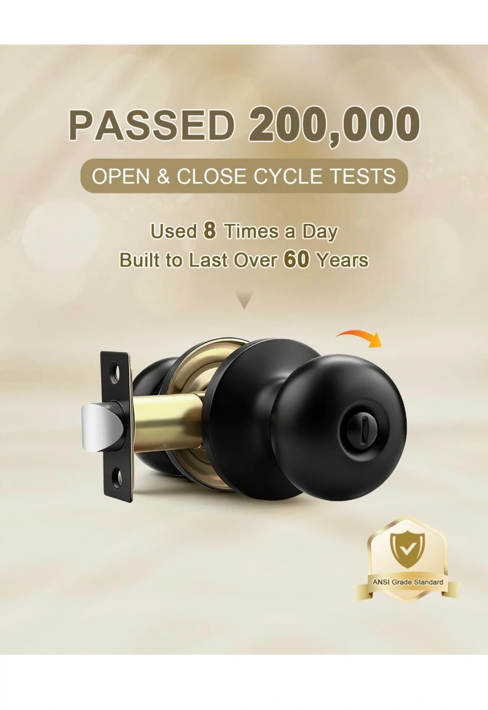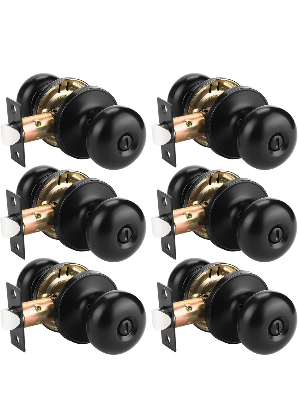 This is a set of 6 privacy door knobs in a matte black finish. They feature a sturdy internal construction and a stainless steel latch. These knobs are ANSI Grade Standard certified and passed 200,000 open & close cycle tests. They're built to last over 60 years.