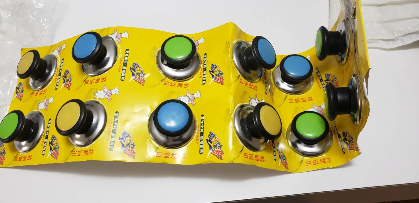 Brand new set of pot lid knobs! These are perfect for replacing old or broken knobs on your pots and pans. The set includes a variety of colours, including blue, green, and yellow. Easy to install and will give your cookware a fresh, new look