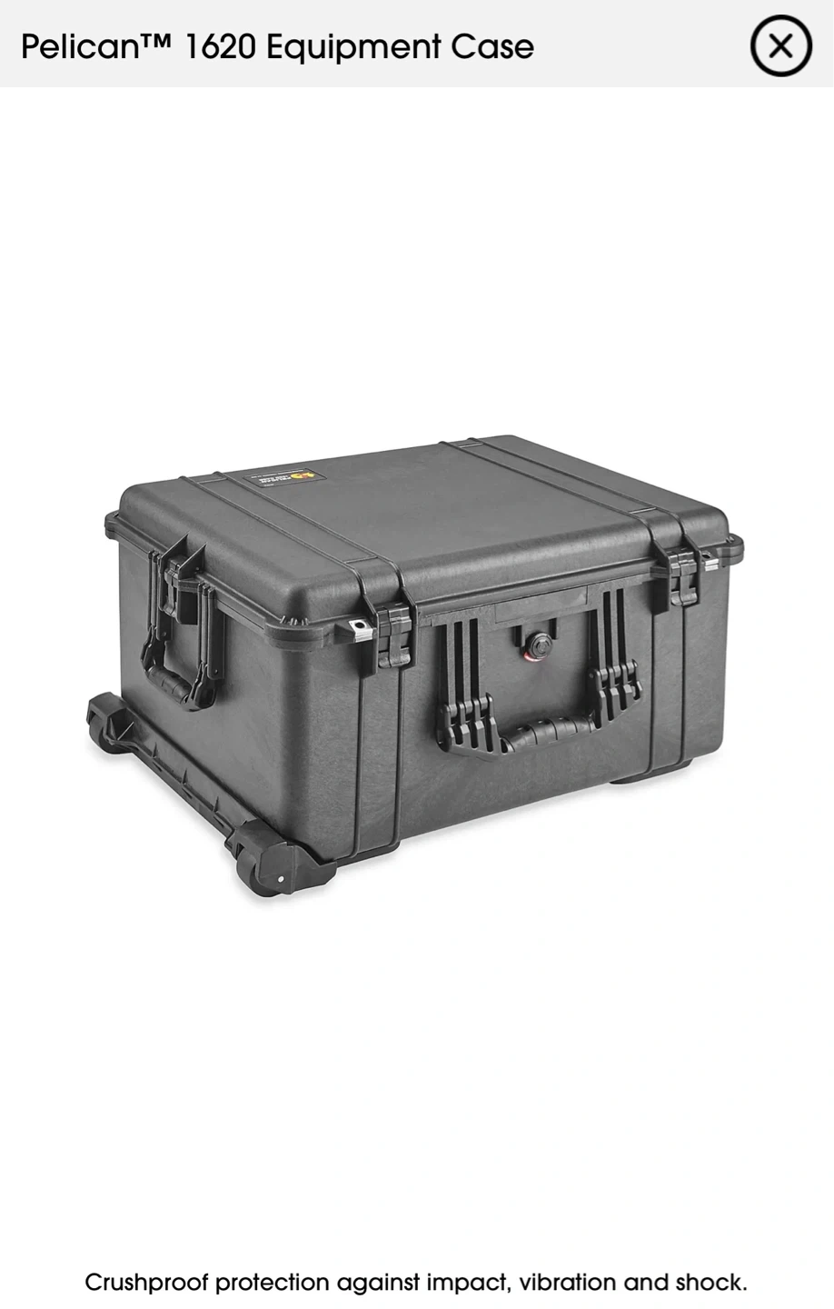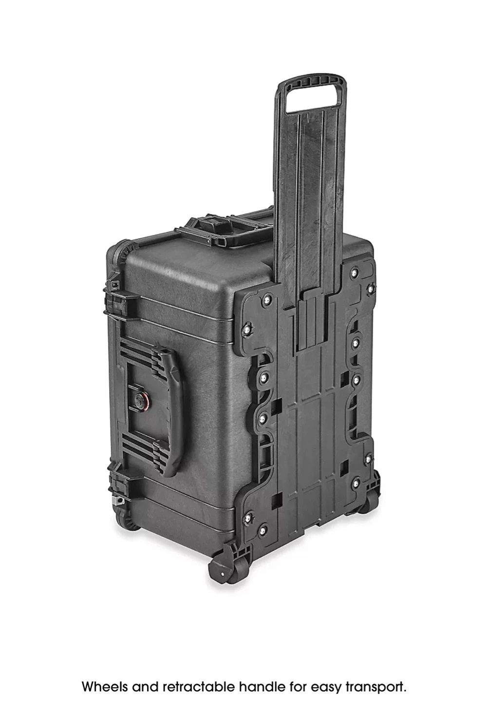 Pelican 1620 equipment case in black. It's crushproof and designed for impact, vibration, and shock protection. Includes wheels and a retractable handle for easy transport. Inside dimensions are 21 x 16 x 12 inches.