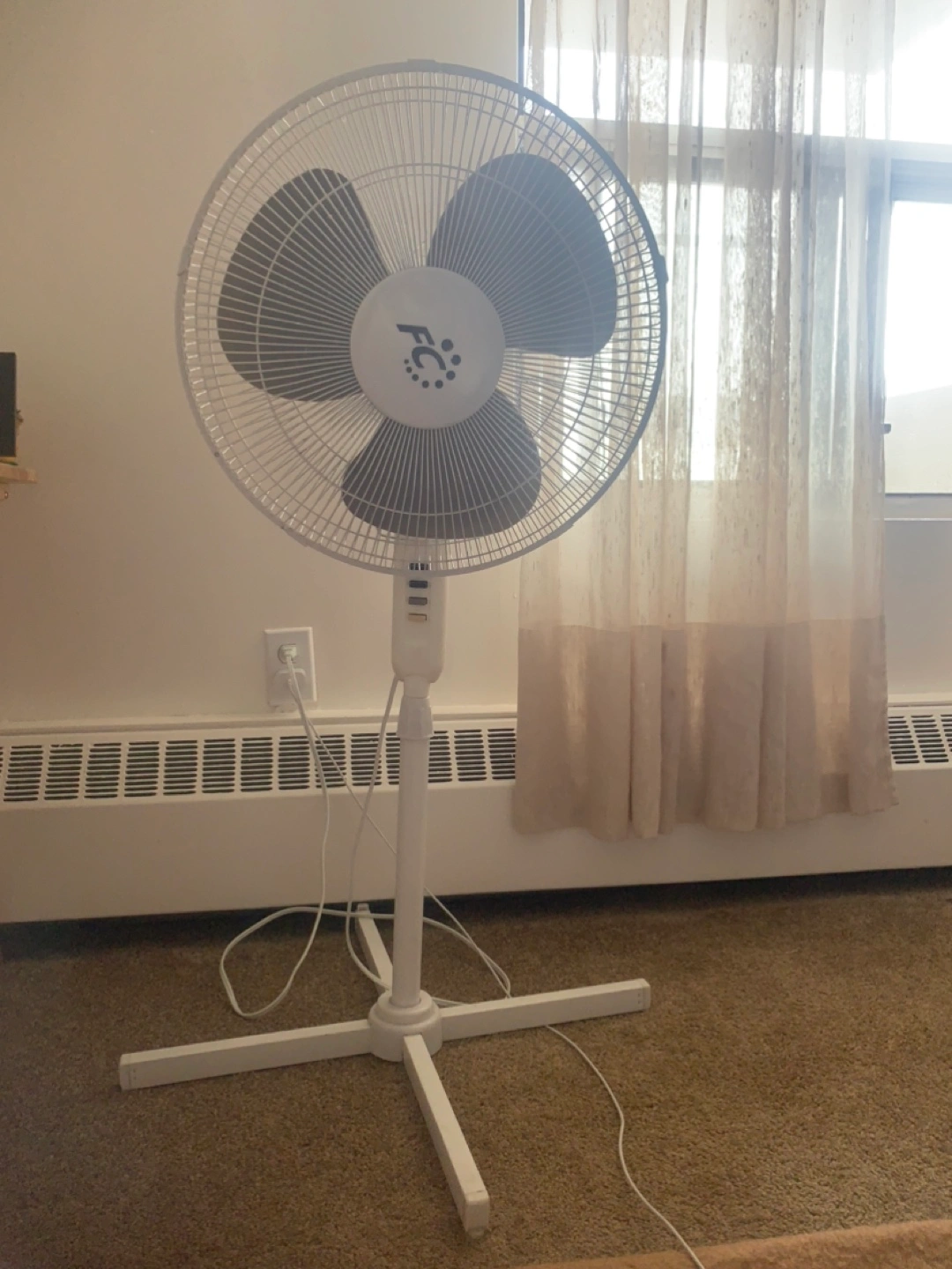 Selling a white stand fan. It's in good condition and ready to keep you cool!