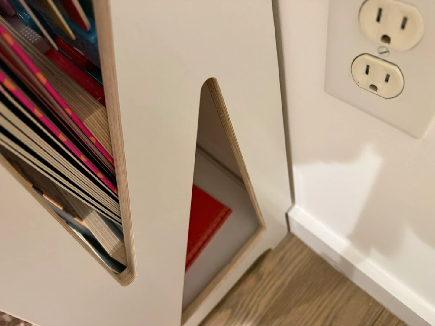 HINGI designer Montessori bookshelf with storage from etsy White and natural wood finish. Offers multiple tiers for book display and storage. It's a sturdy and stylish addition to a child's room! There’s some minor chip on the side from delivery shipping.