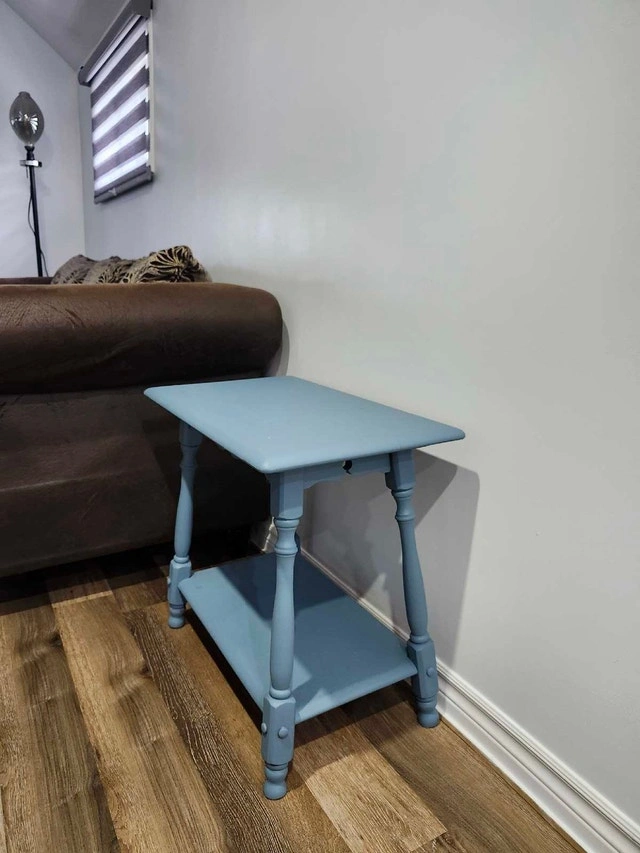 This blue table brings a touch of rustic charm with its sturdy construction and unique, hand-painted finish. Perfect as a side table or nightstand, it features a top surface and a lower shelf for extra storage or display. This is a used item. Unfortunately, I don't have specific measurements for this table. I'm pricing it at $45, based on similar tables listed on Kijiji. If the ad is still up, it's available! Don't miss out on adding this lovely piece to your home; it's waiting to be whisked away to its new abode. Cash accepted.
