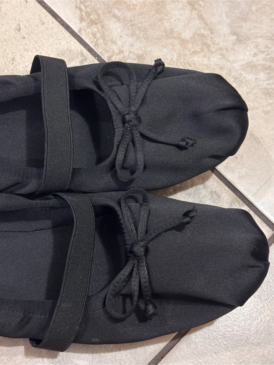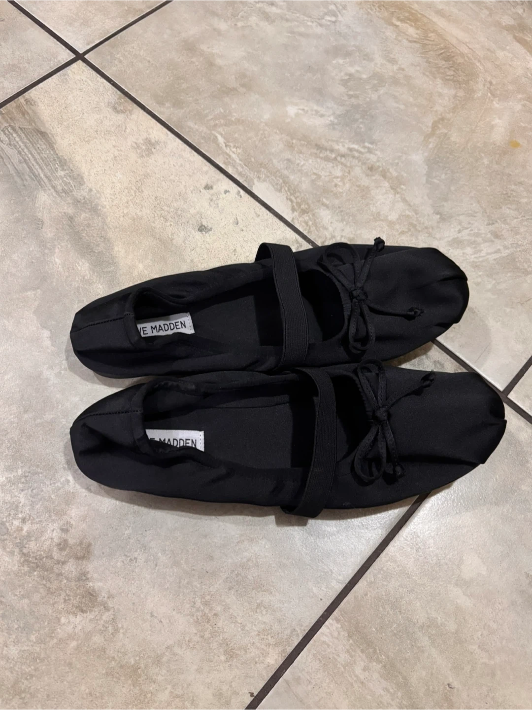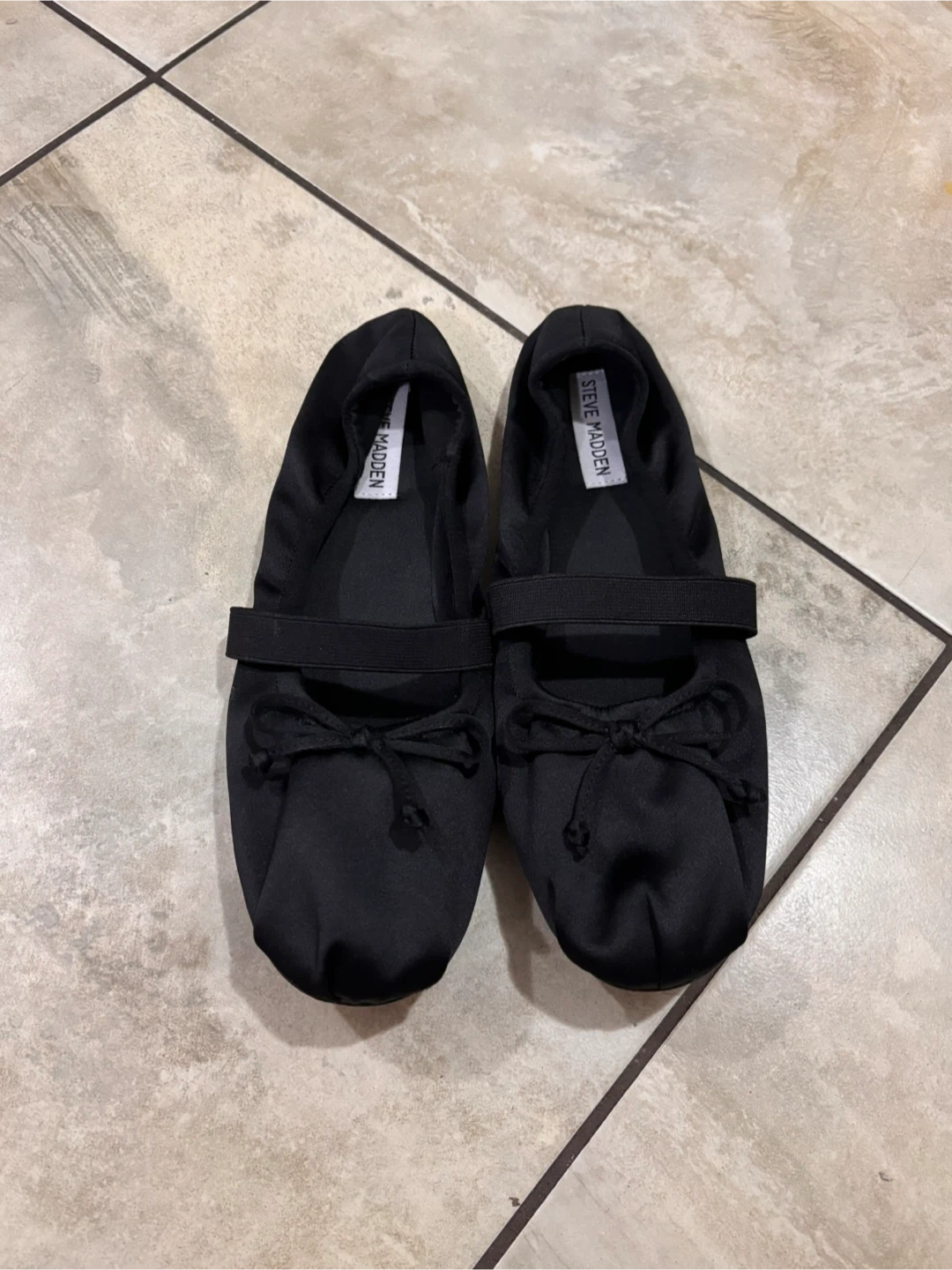 Steve Madden sheer black fabric ballet flats with an elastic strap and bow detail. Made with fabric material.