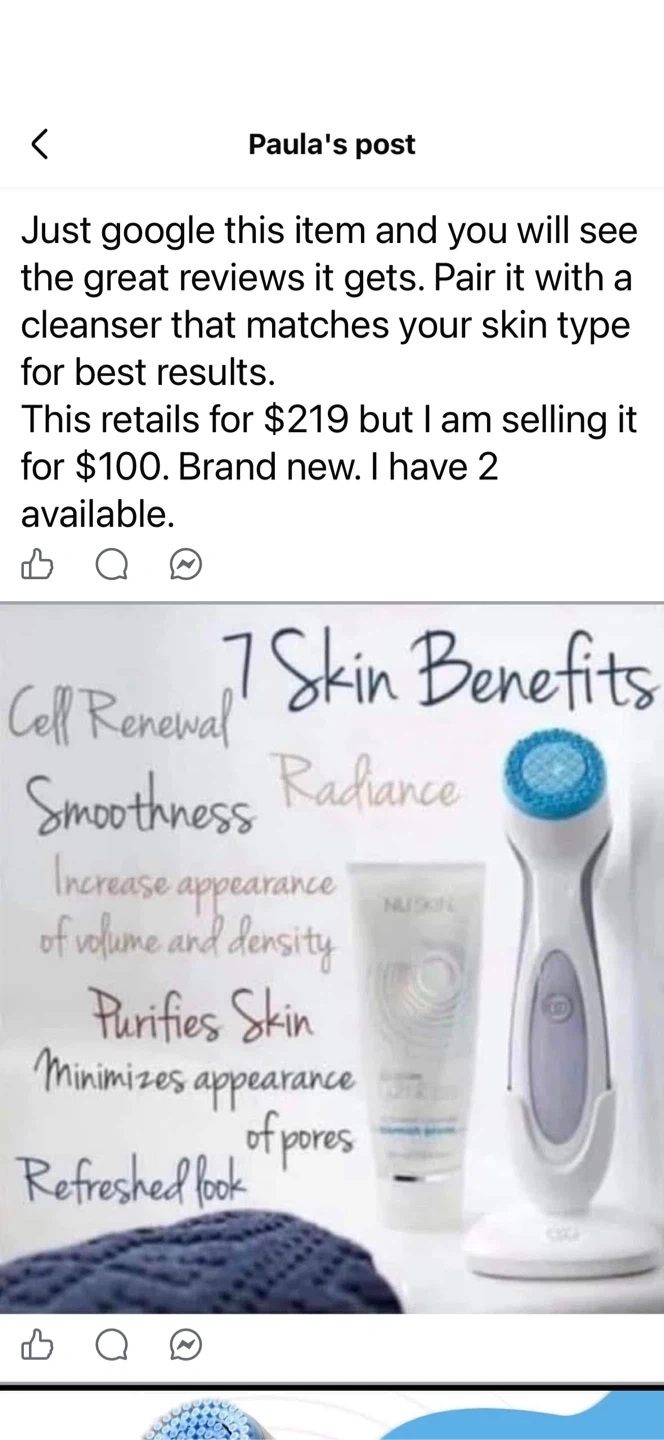 This is a brand new Nu Skin LumiSpa facial cleansing device. It offers 7 skin benefits for clarity, softness, radiance, smoothness, purified skin, reduced pore appearance, and visibly improved firmness. Use it twice daily for optimal results.