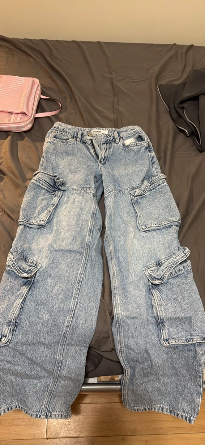 These Garage light wash cargo jeans offer a relaxed fit. They feature multiple pockets for practicality. Made from denim.