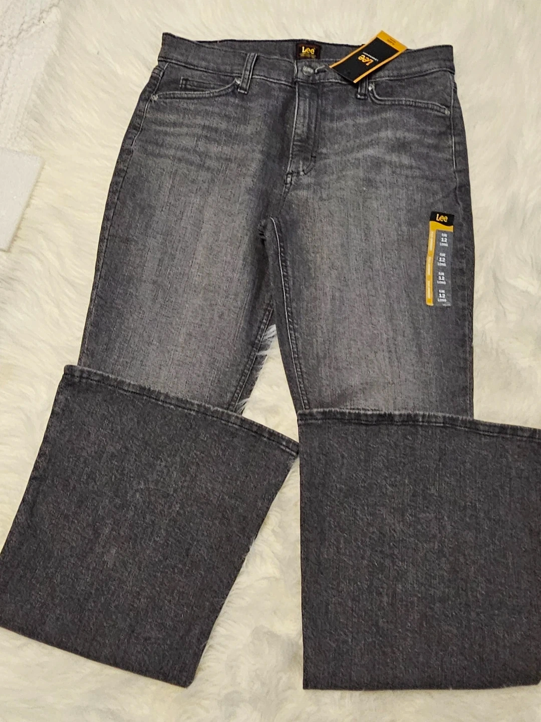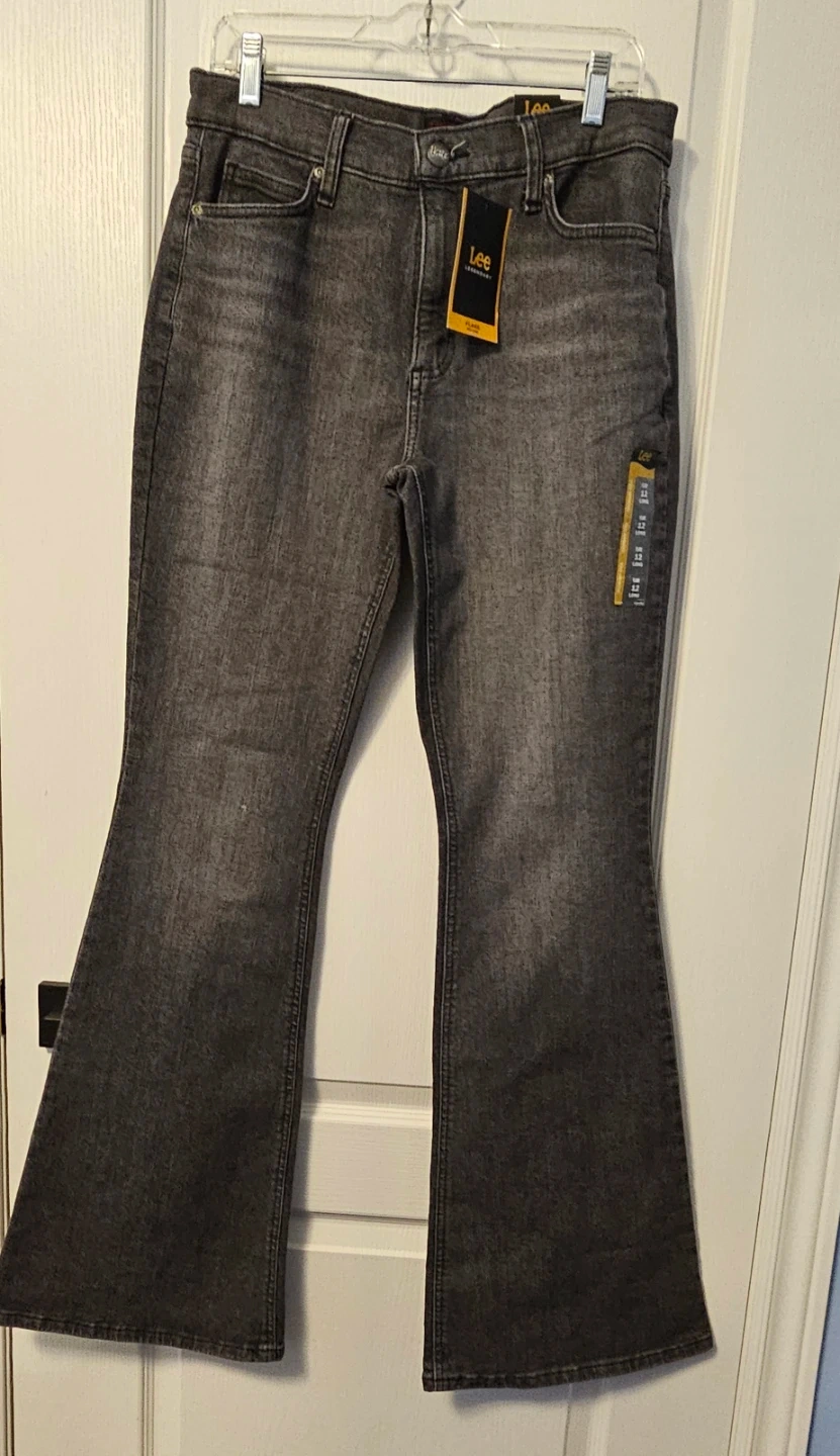 These are Lee women's flare jeans in a Blurred Dark, Legendary Style, Mid-rise. They're made from denim fabric. Flare leg style.