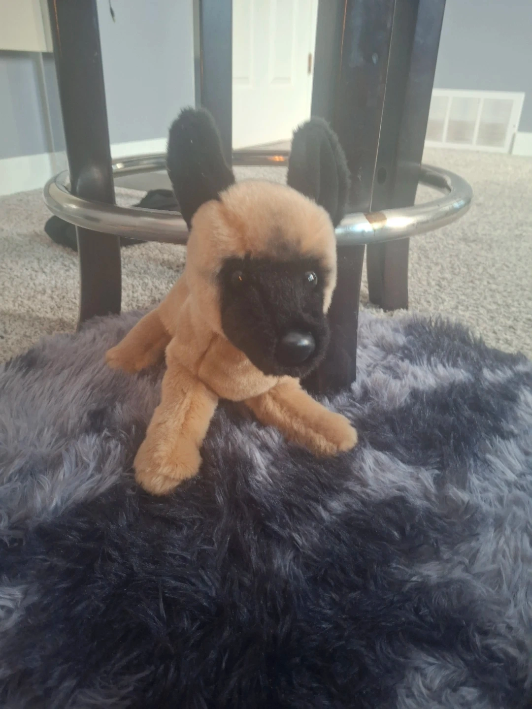 This is a plush stuffed animal resembling a German Shepherd dog. It's soft and cuddly, with realistic colouring. Makes a great companion for anyone who loves dogs!