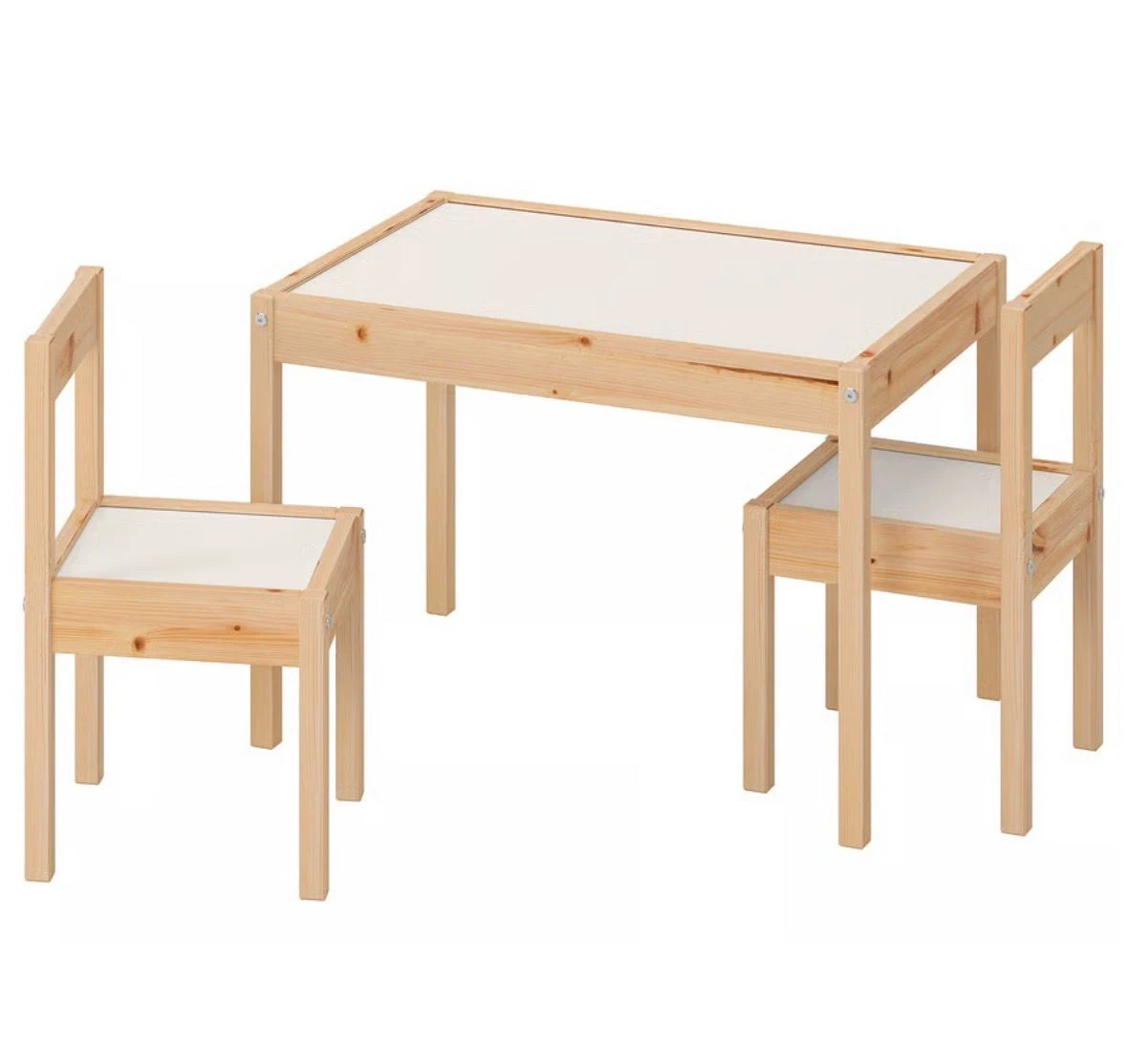This is a children's wooden activity table with two matching chairs. The table and chairs are made of natural pine wood with white inserts on the table surface and chair seats. It's a sturdy set for little ones to draw, play, or do crafts.