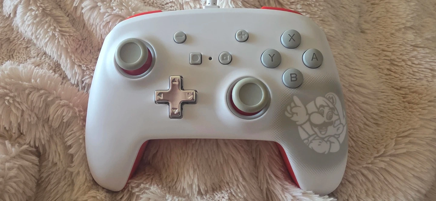 White Nintendo Switch Pro controller with red accents. Features a Mario graphic on the right grip. It's a wired controller, perfect for extended gaming sessions! Suitable for playing your favourite Switch games.