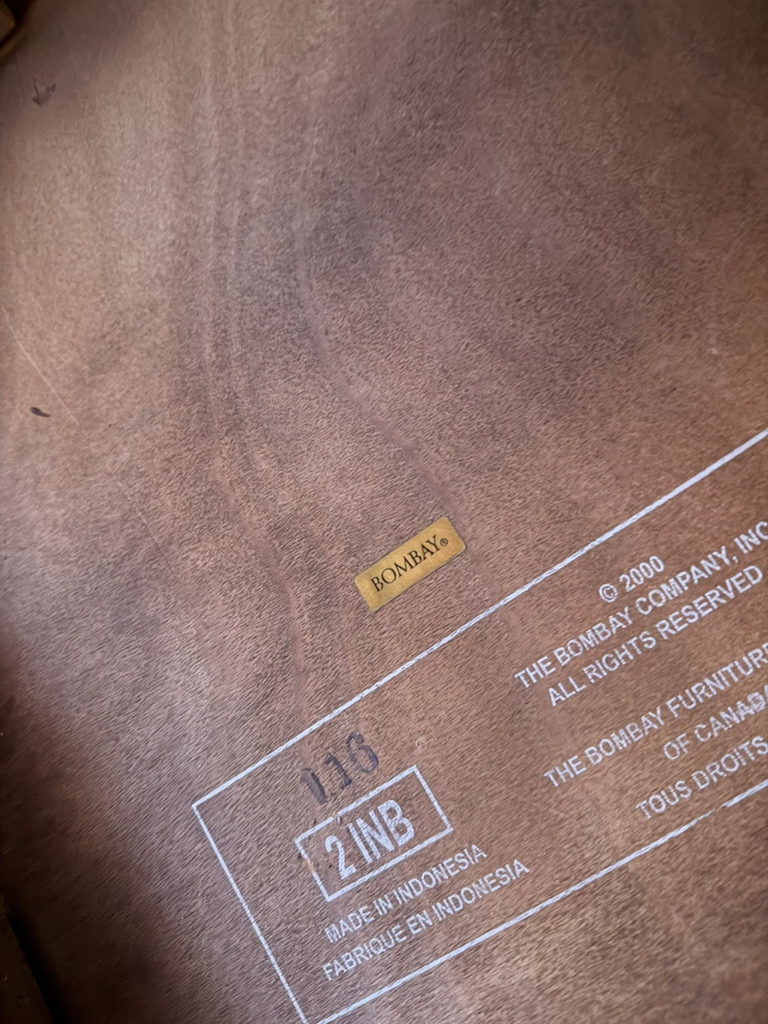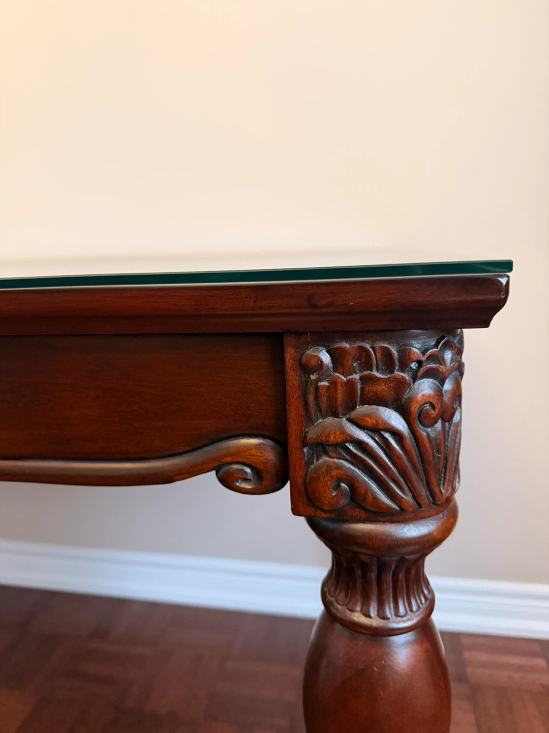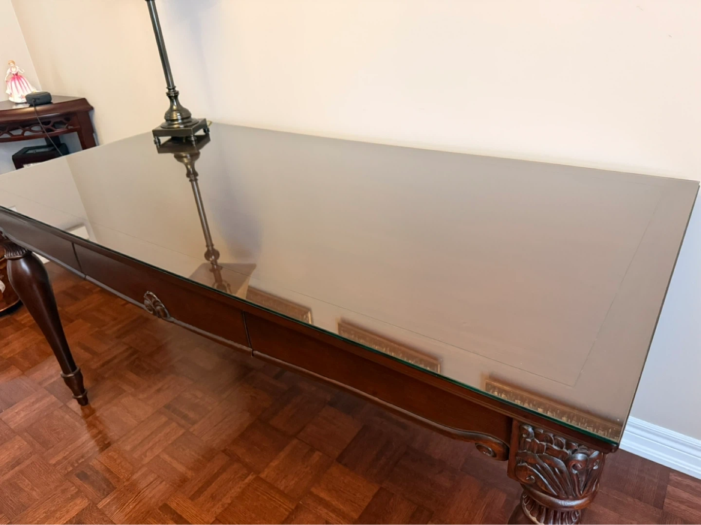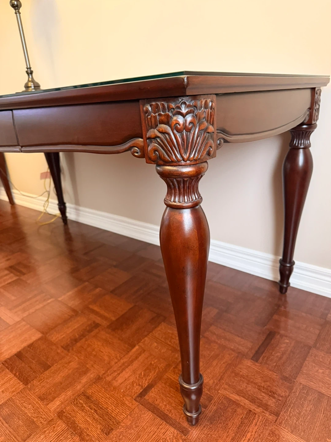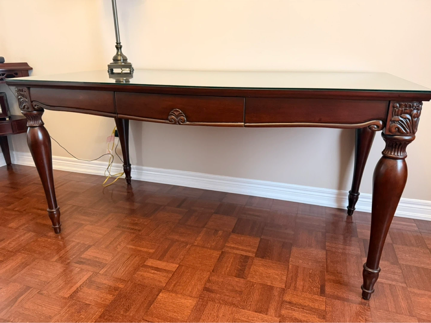 This Bombay Company desk features a rich wood finish and decorative carvings on its legs. It comes with a protective glass top. The desk has two drawers for storage. It's a sturdy piece for a home office or study.