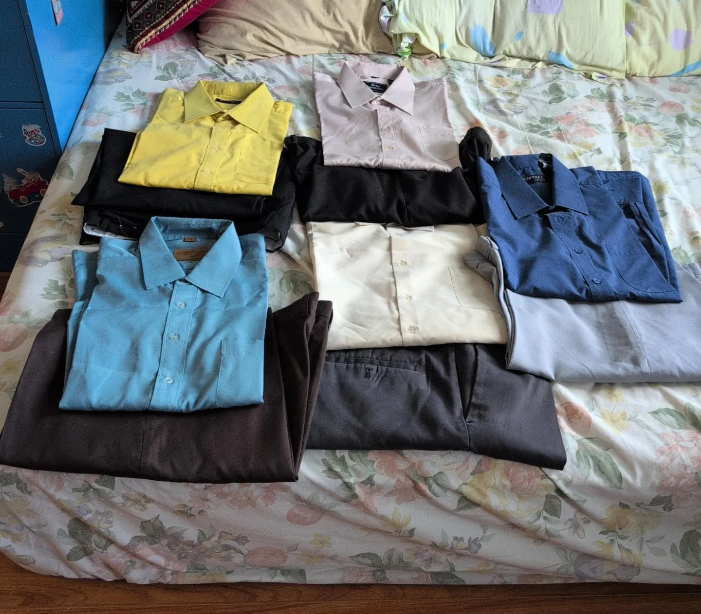 Bundle of men's dress shirts and pants in various colours. Includes blue, yellow, pink, cream, and navy shirts. Also includes black, grey, and brown pants. Shirts appear to be polyester blend.