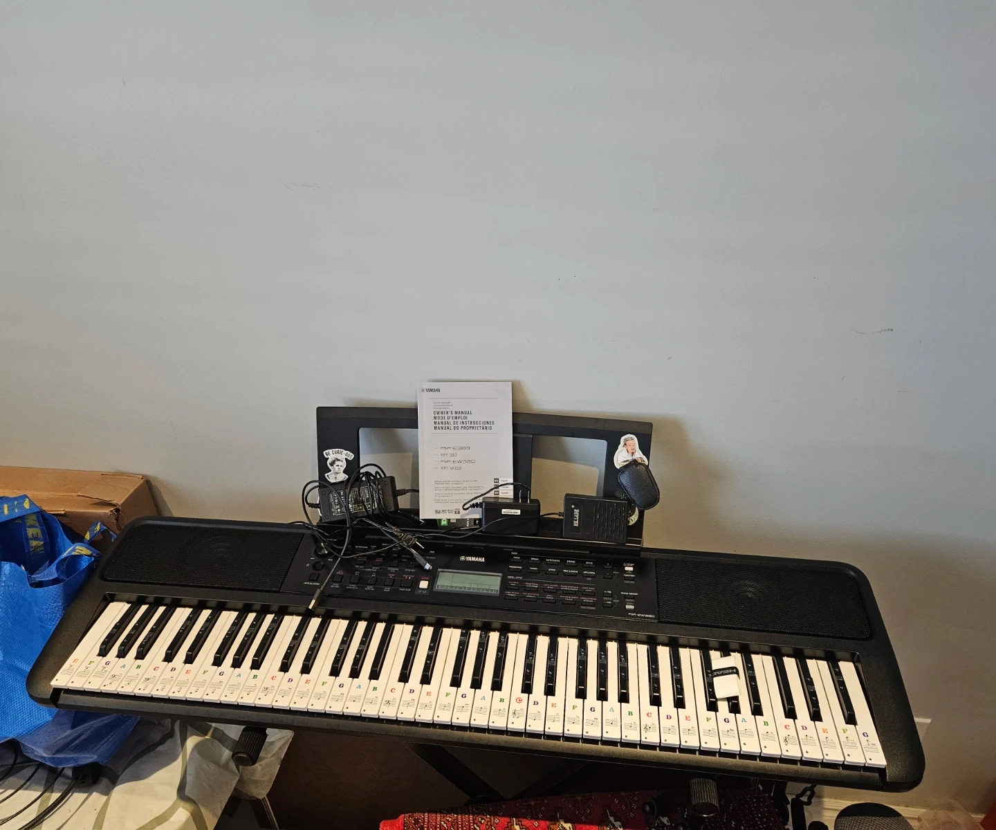 This is a Yamaha PSR-GW300 keyboard. It has 61 keys with stickers for learning. Includes power adapter and sustain pedal.