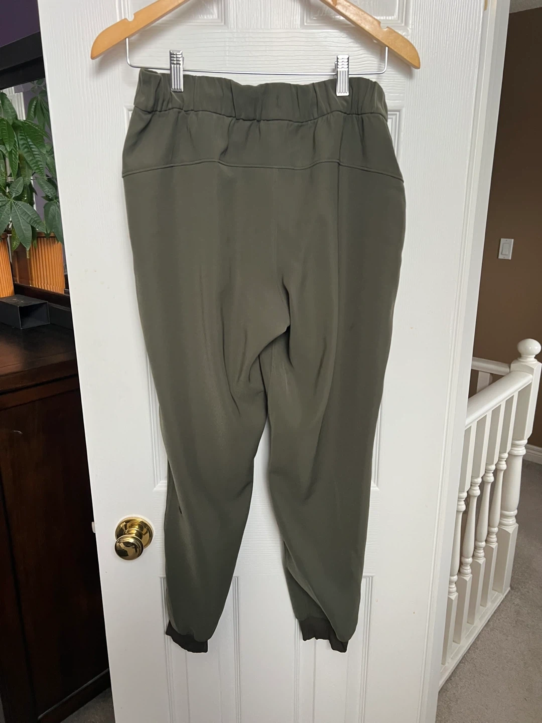 These Lululemon jogger pants are a size 8 and come in a nice olive green colour. They're made with a comfortable fabric. Perfect for casual wear or light workouts!