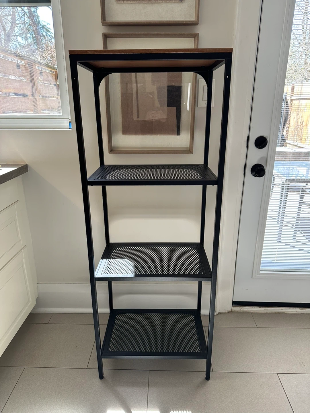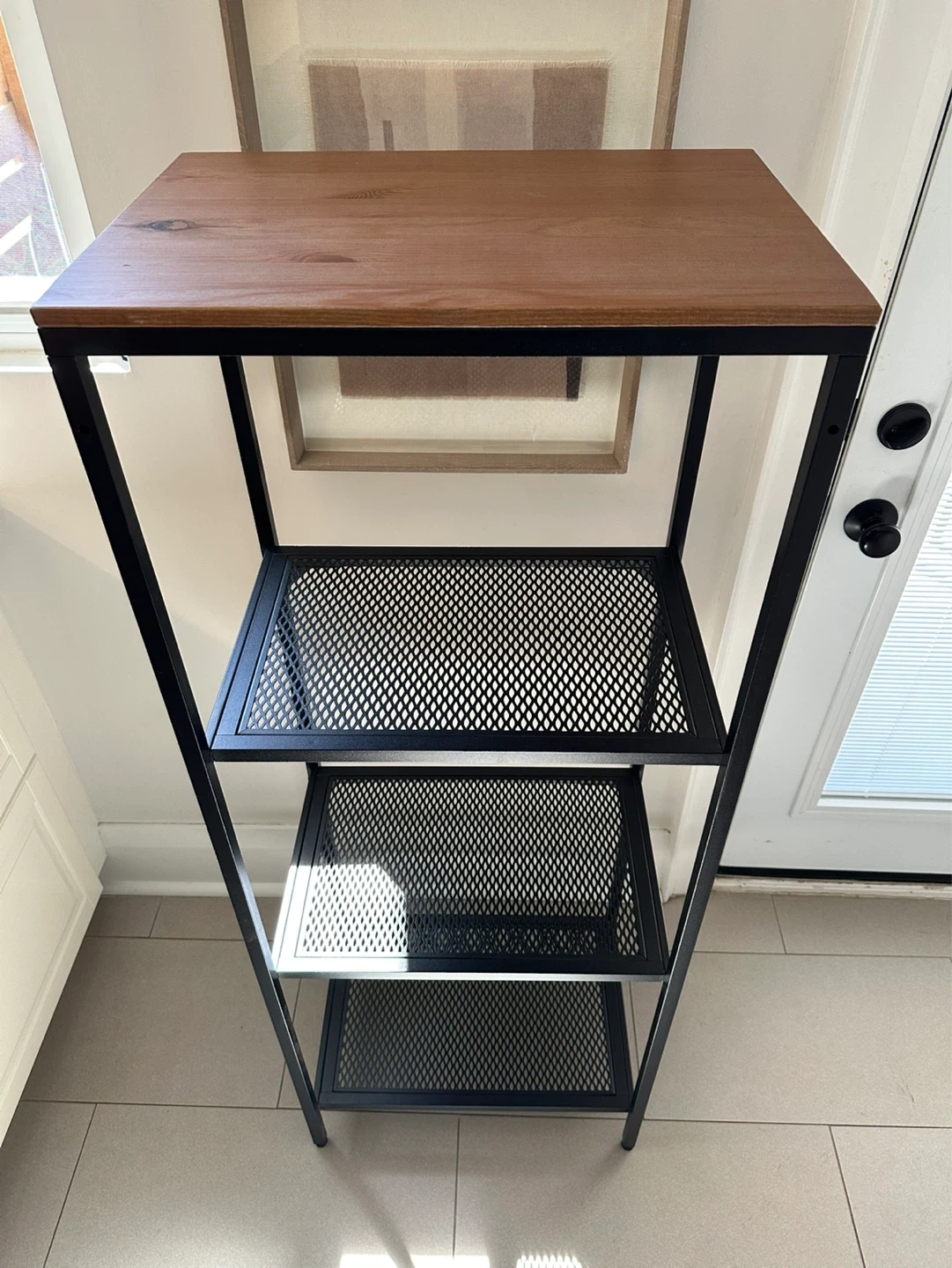This is a three-shelf display unit featuring a wood top shelf and 3 metal mesh shelves. The frame is black metal. It's a slim design, perfect for smaller spaces.