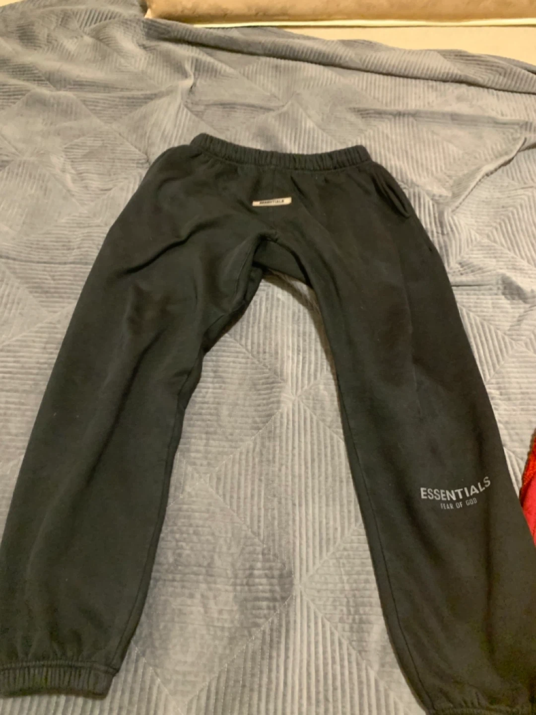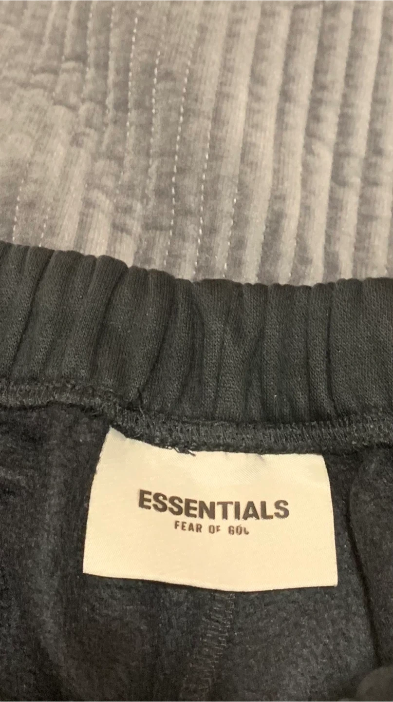 Black sweatpants from Fear of God Essentials. It's made with a comfortable material. These pants are perfect for casual wear.