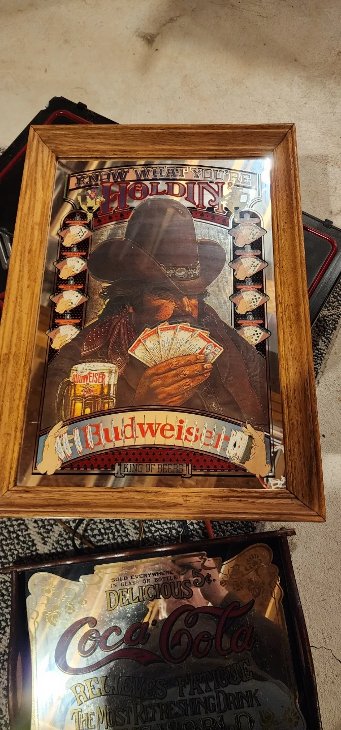 This is a Budweiser mirror featuring a cowboy playing poker and the Budweiser King of Beers logo. It has a wooden frame and measures approximately 20x16 inches. The mirror depicts cards and a beer mug.