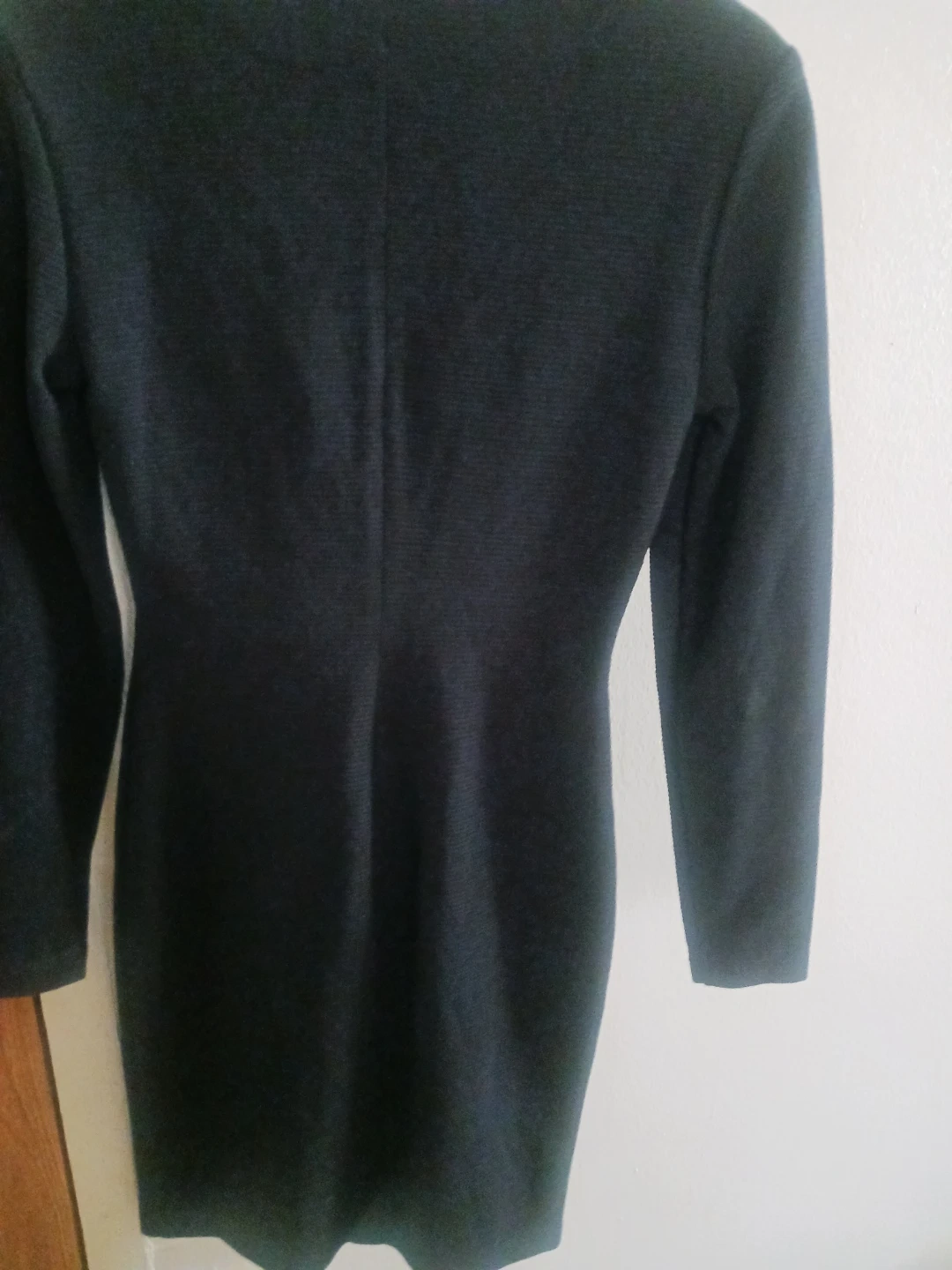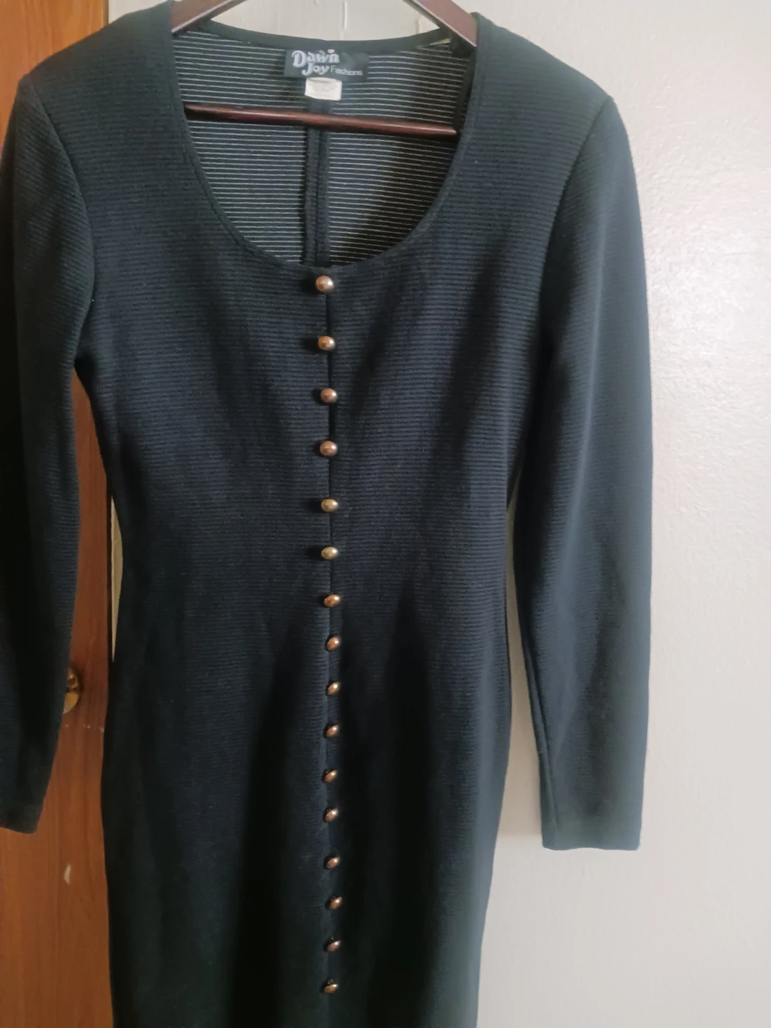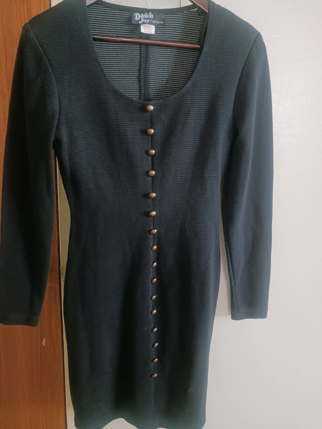 This is a black long-sleeved dress from Dawn Joy Fashions. It features a full button-front closure with gold-tone buttons. The fabric has a subtle ribbed texture.