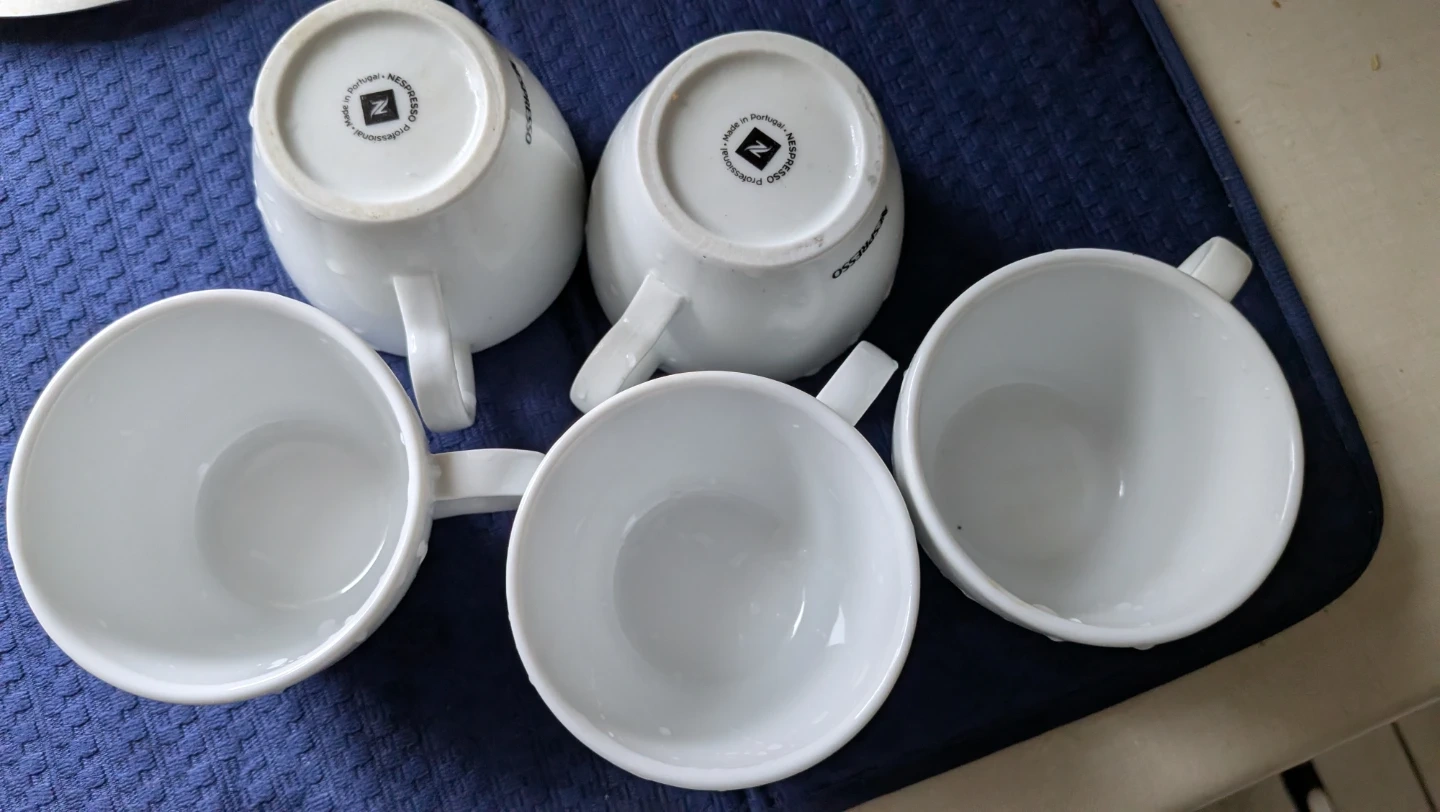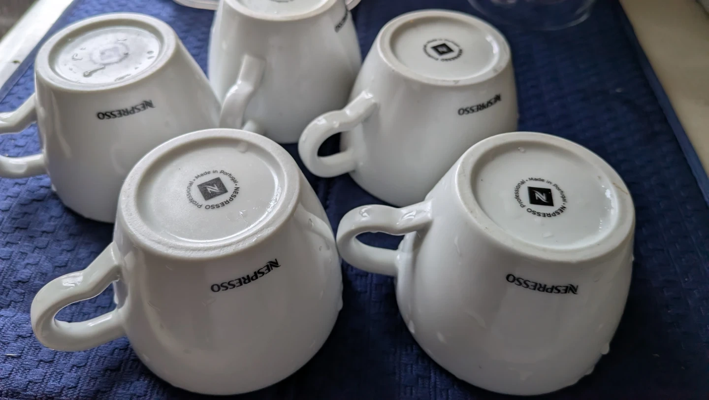 Set of five Nespresso espresso cups. These white ceramic cups are perfect for enjoying your morning espresso. Made in Portugal.