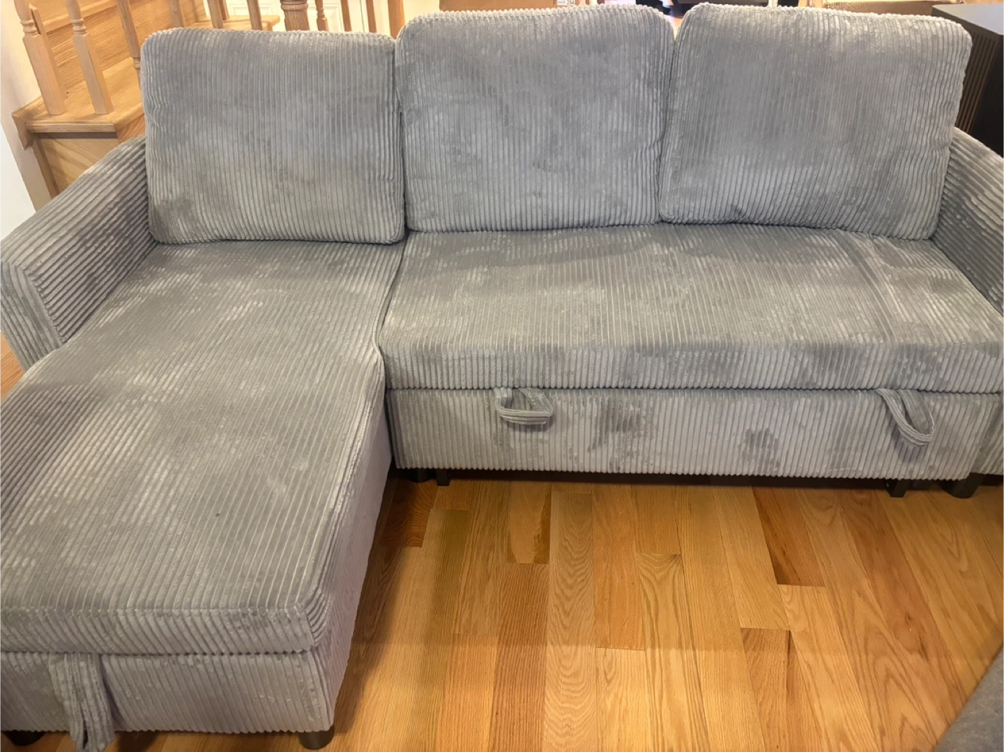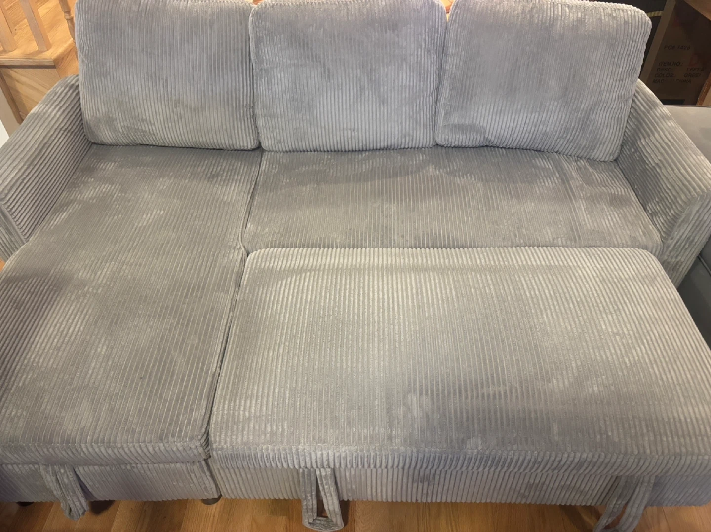 This comfy grey corduroy pull out sectional sofa offers ample seating. It features hidden storage within the chaise and under the main seating area. The fabric's ribbed texture adds a nice touch.available for delivery and pickup