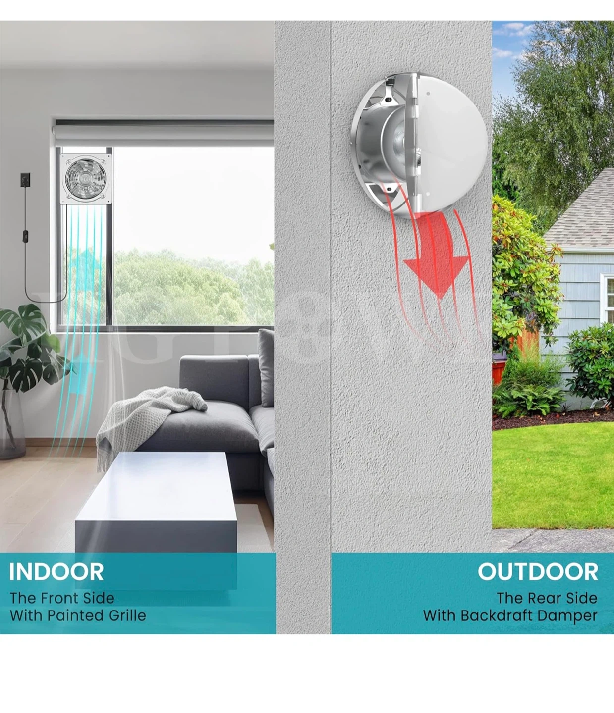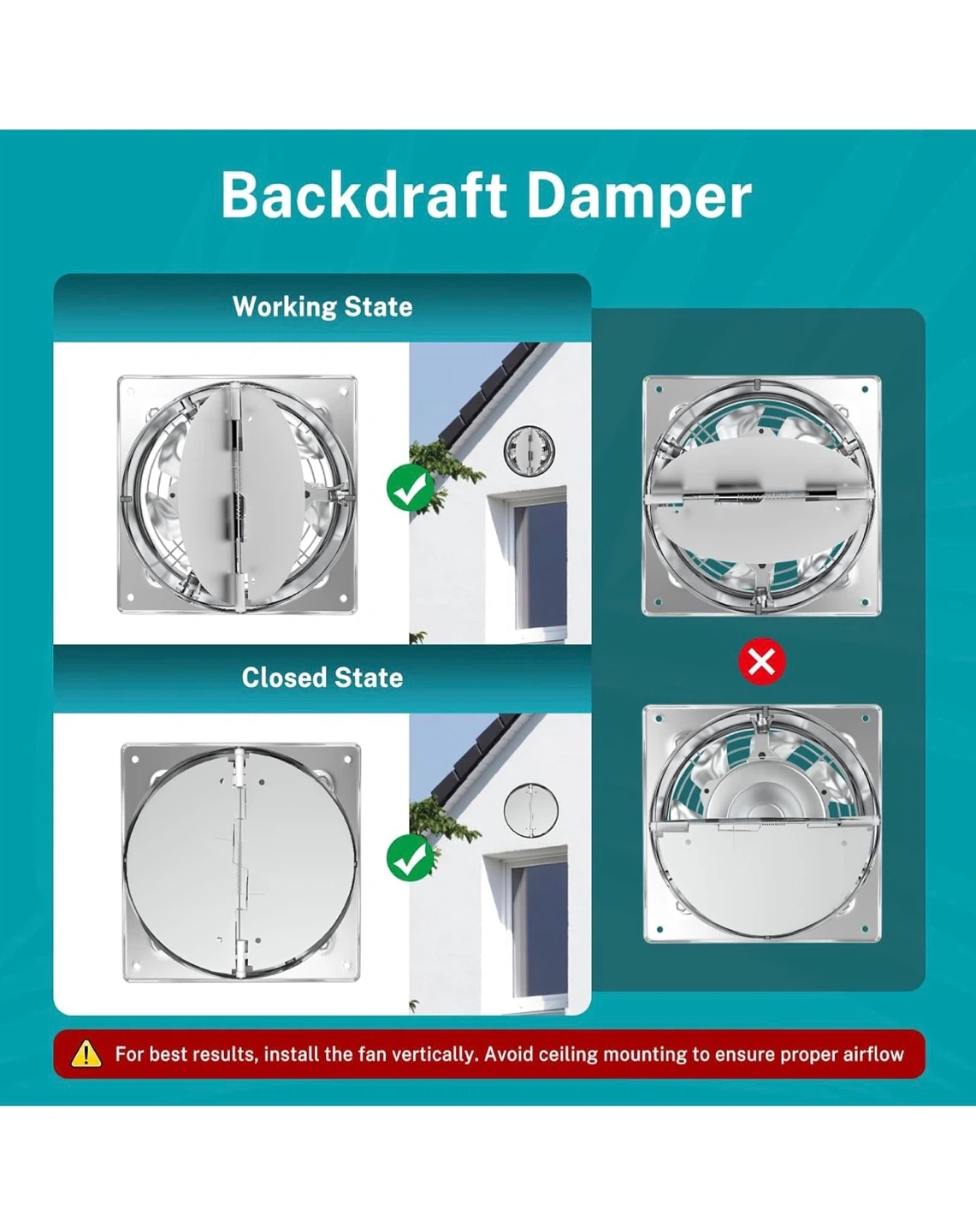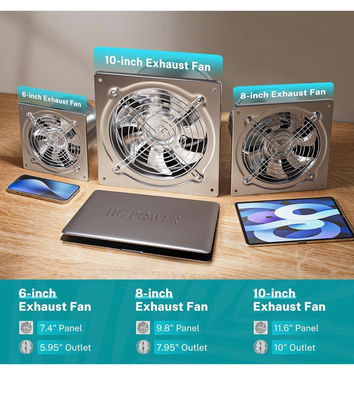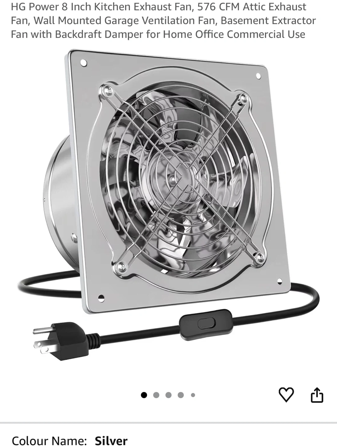 This is an 8-inch HG Power exhaust fan with a backdraft damper. It's made of stainless steel and operates at 576 CFM with 7 fan blades. The fan has a noise level of 50dB.