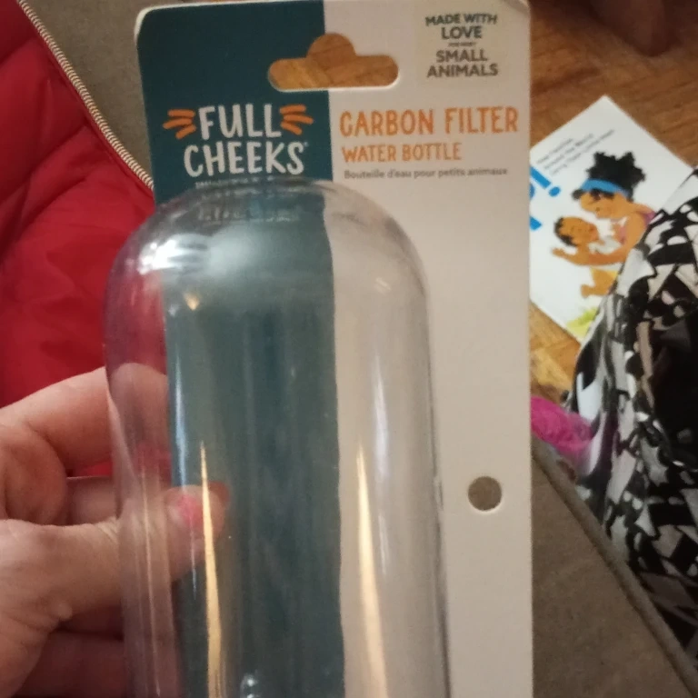This is a Full Cheeks carbon filter water bottle. It's designed for small animals. The bottle is clear plastic with a metal spout.