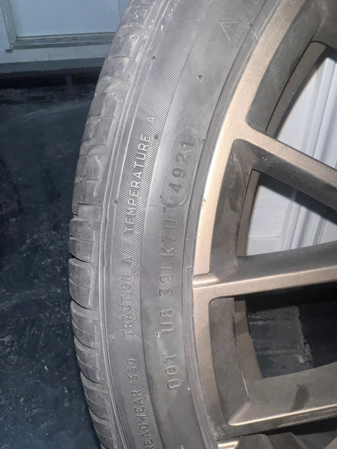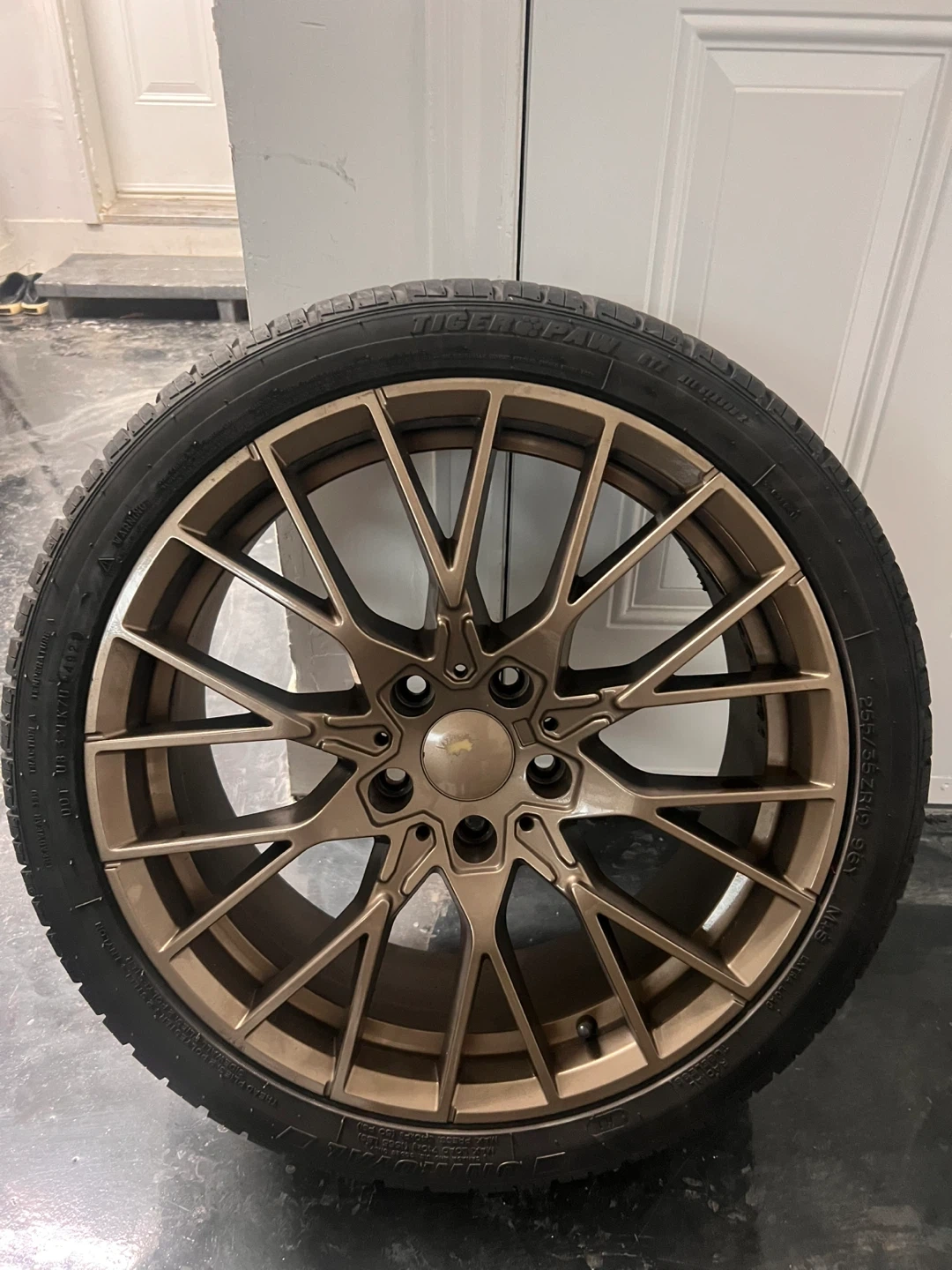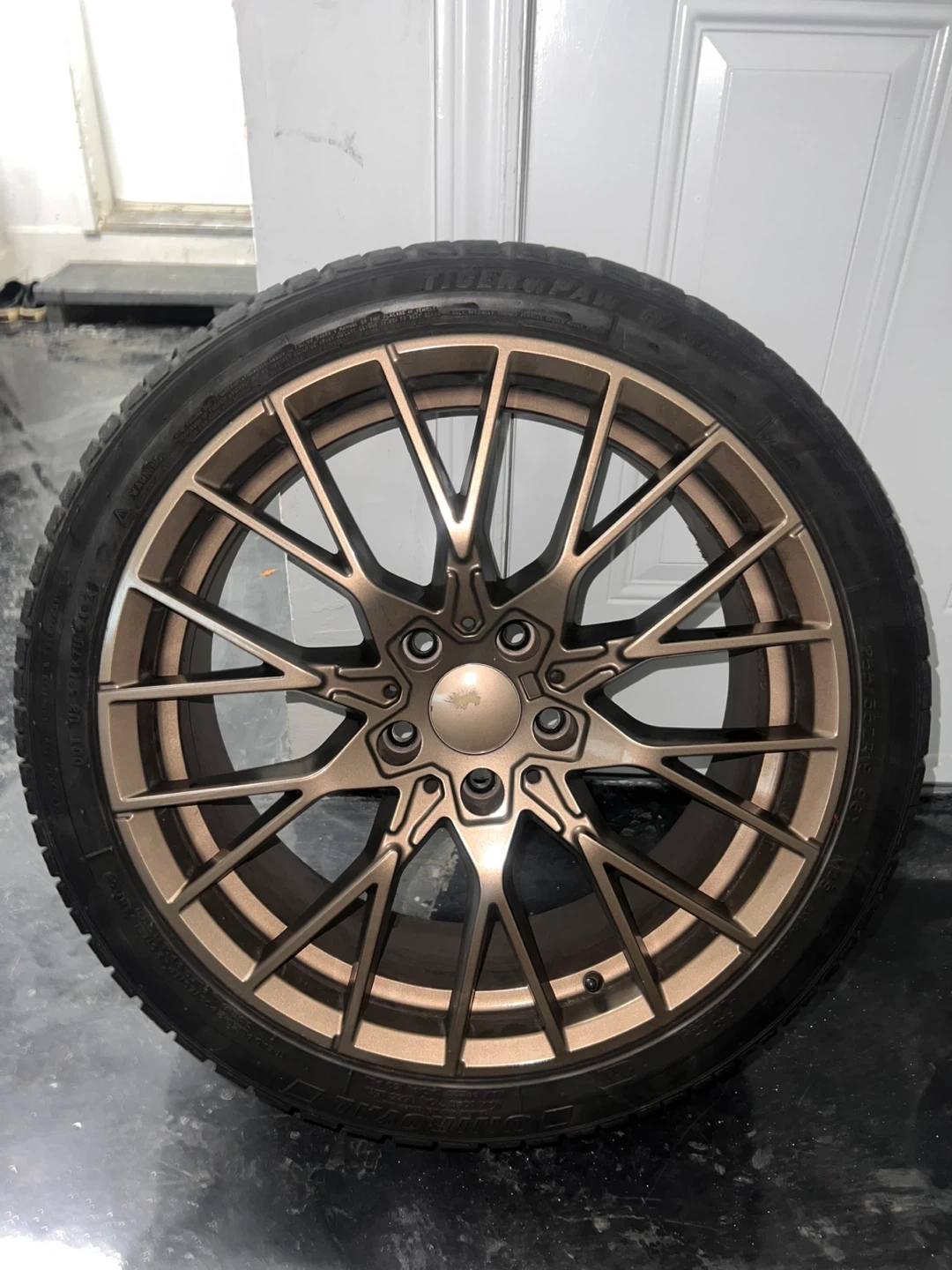 4 Bronze aftermarket wheel with a tire. Tire size is 255/35ZR19 96Y. This wheel would be useful as a replacement or for a custom setup. Bolt pattern 5x120, tires only used for 1 season