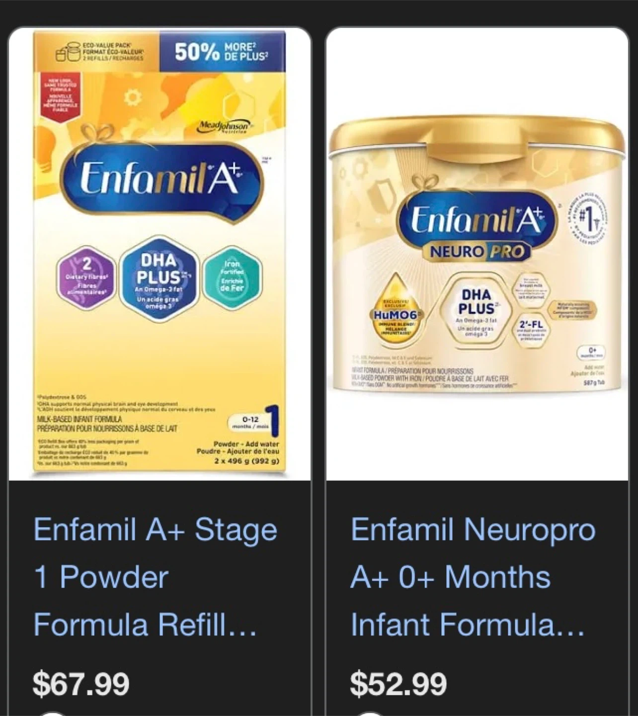 Enfamil A+ Stage 1 powder formula for babies 0-12 months. It's a milk-based infant formula with dietary fibres and iron fortified.