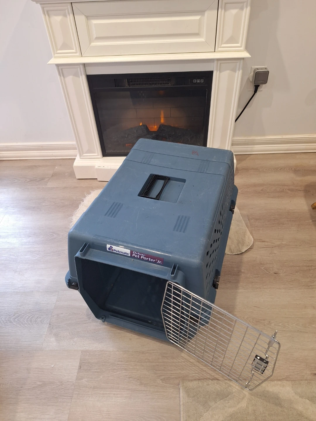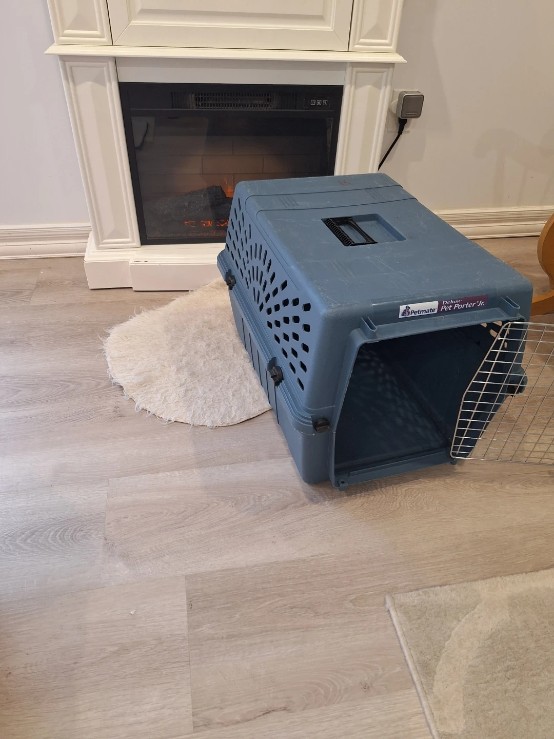 This is a blue Petmate Deluxe Pet Porter Jr. carrier. It features a metal door and vents for airflow. Suitable for small pets for travel or transport.