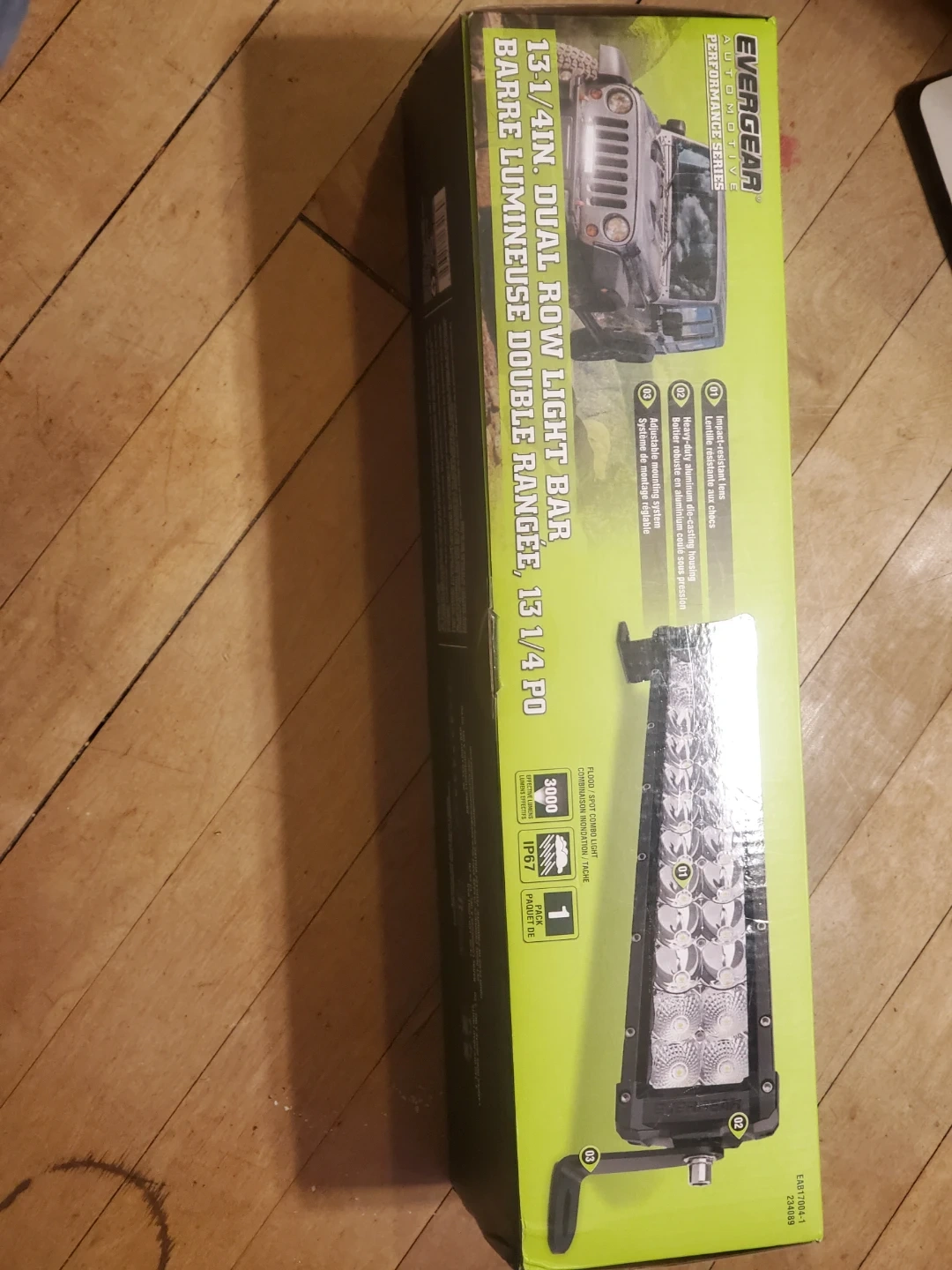 This is an Evergear 13-1/4 inch dual row light bar. It has an impact-resistant lens and heavy-duty aluminum housing. It also features an adjustable mounting system. 3000 lumens.