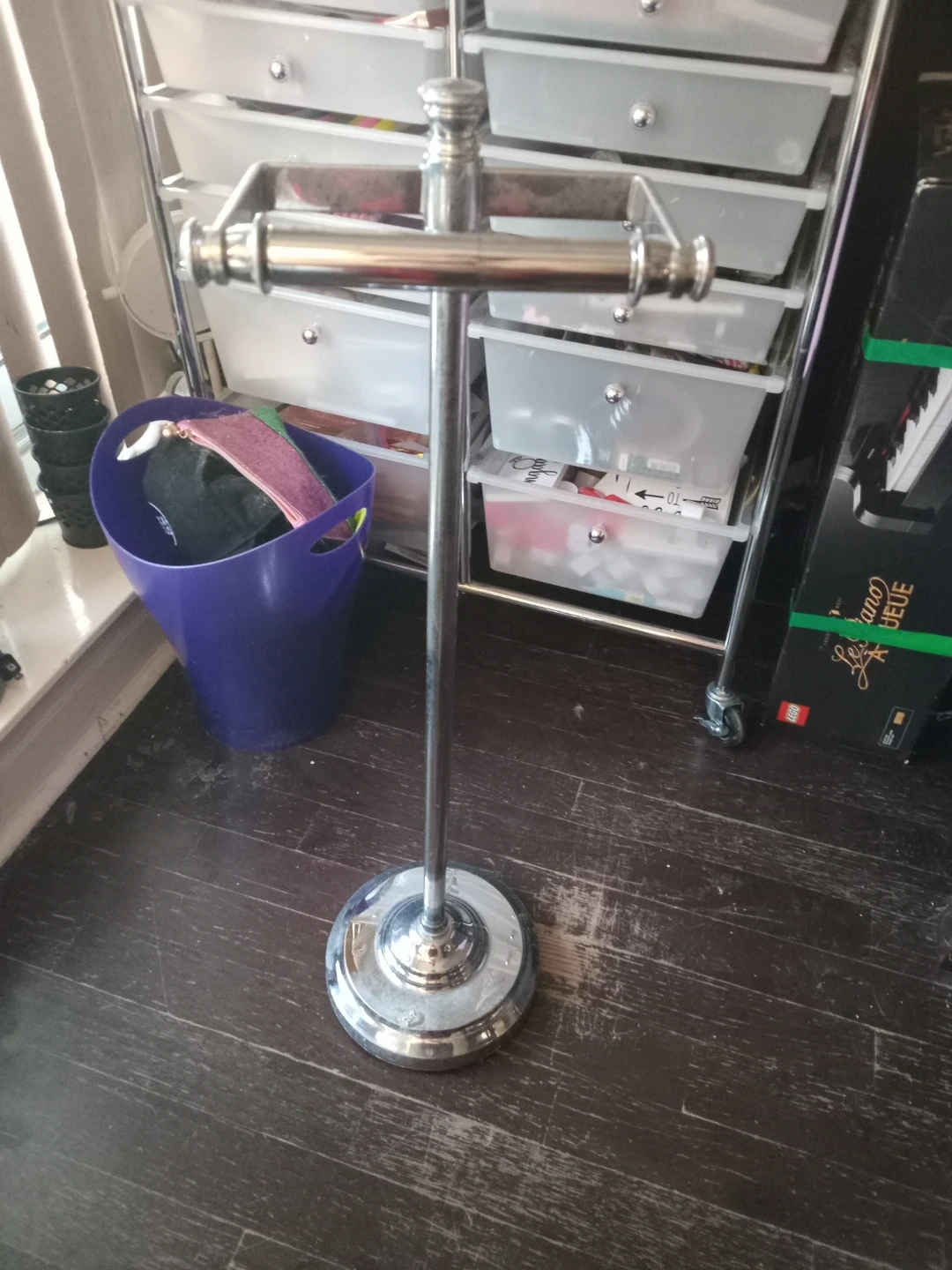 This is a chrome freestanding toilet paper holder. It has a sturdy base and can hold multiple rolls. Useful for keeping extra toilet paper handy in the bathroom.