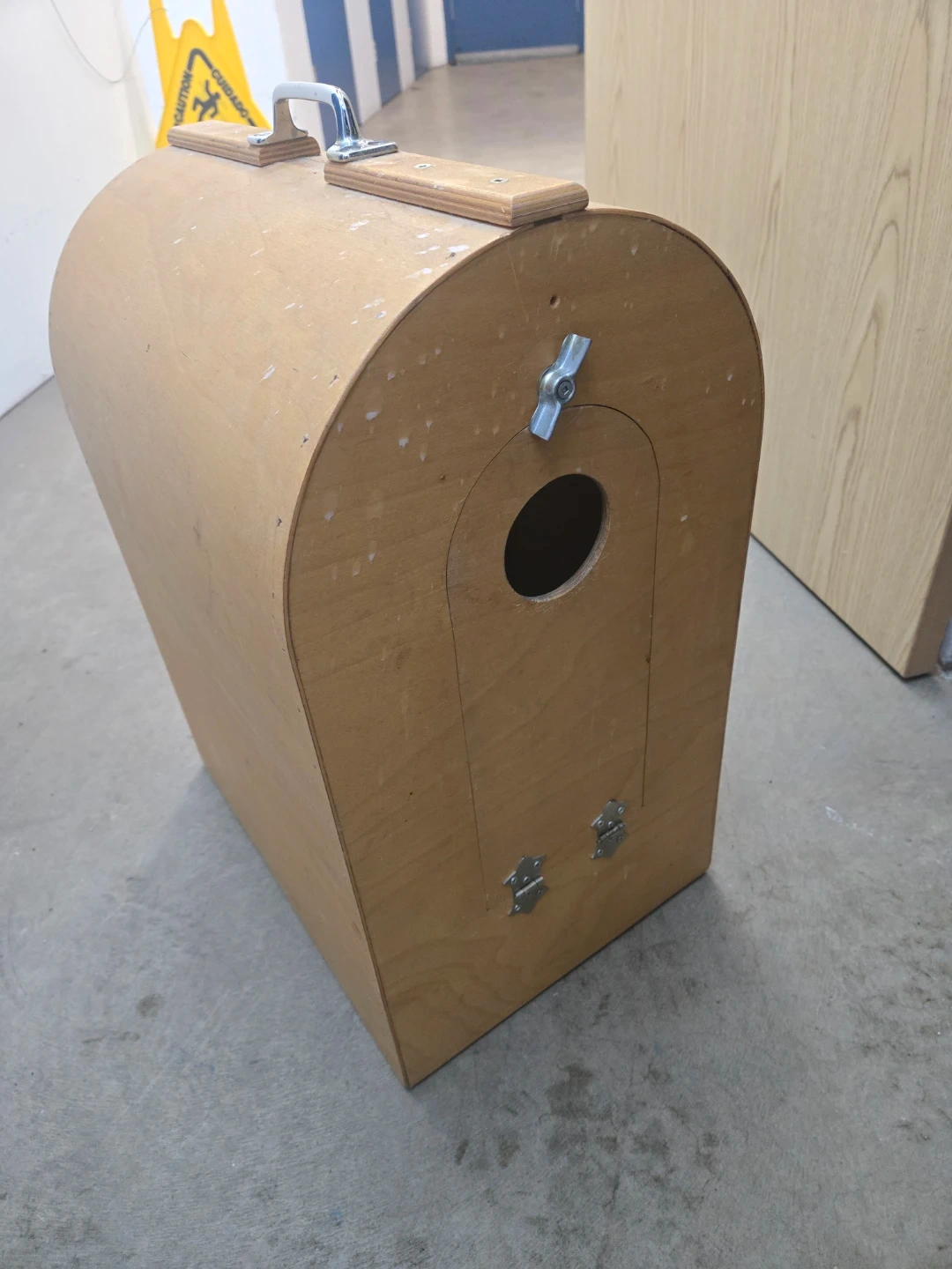 This is a unique, handmade wooden carrier with a rounded top and a carrying handle. It features a circular opening on the front and small latches on the bottom panel. It's a durable and portable option for transporting small animals. Measures approximately 18 inches tall and 14 inches wide.