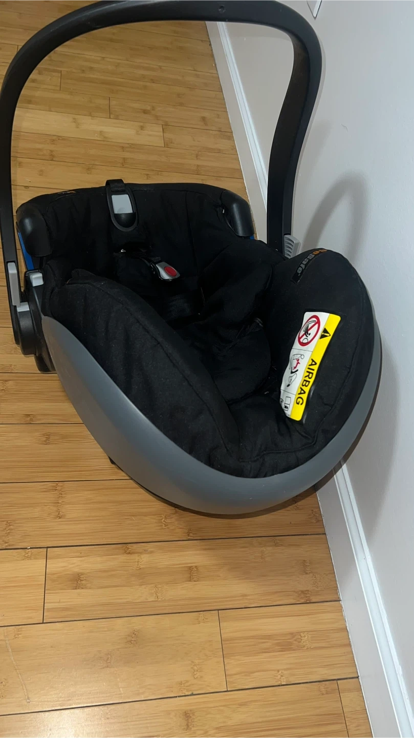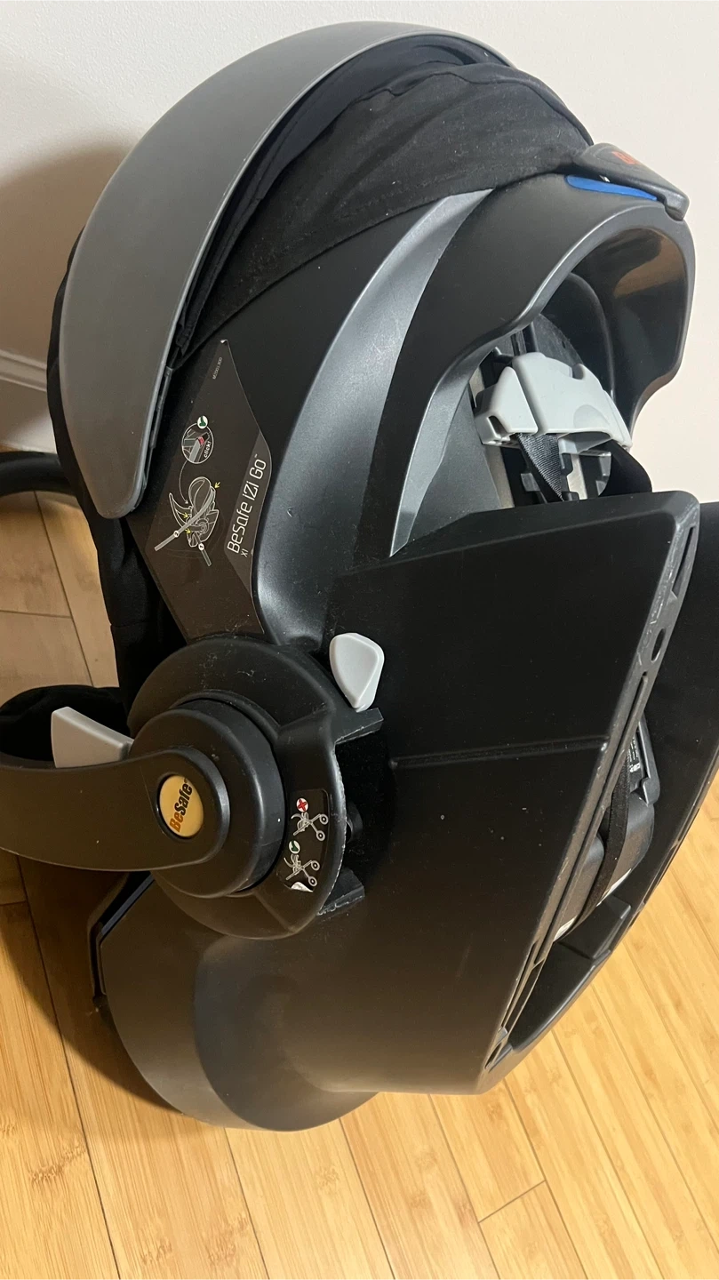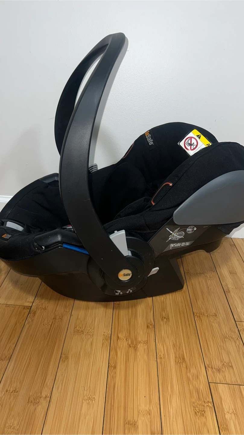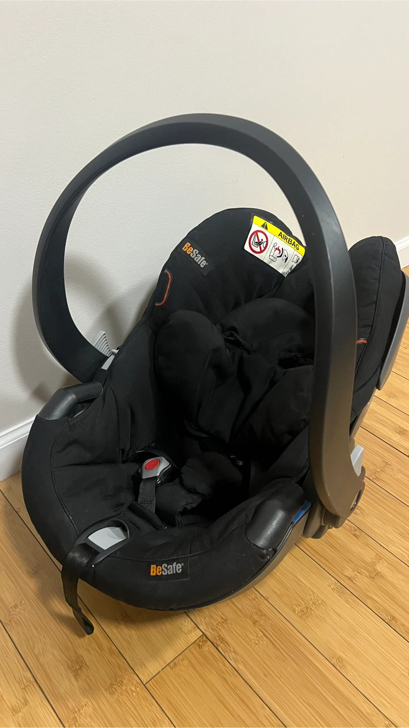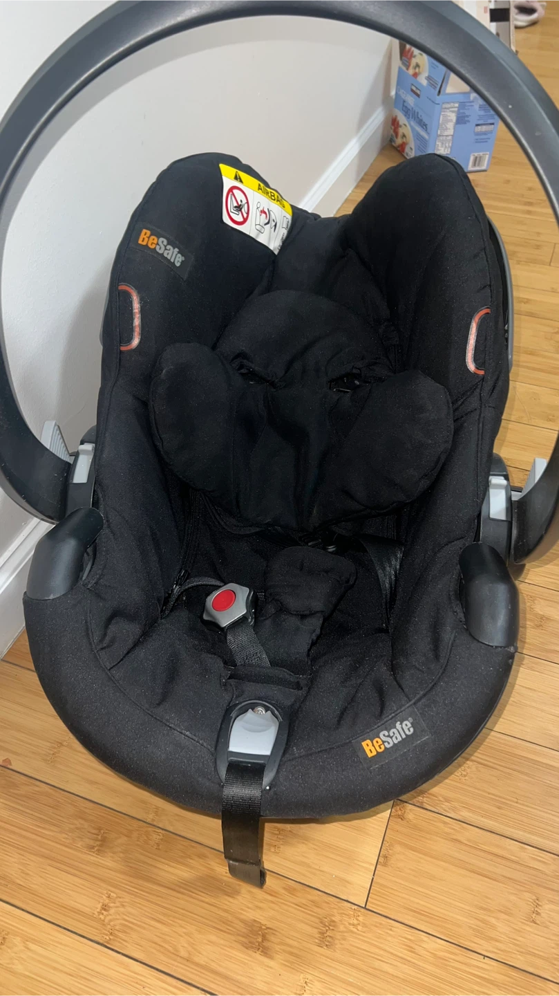 2 Black BeSafe infant car seat. It features a 5-point harness system for safety. The seat has an adjustable handle for easy carrying. Compatible with many strollers.