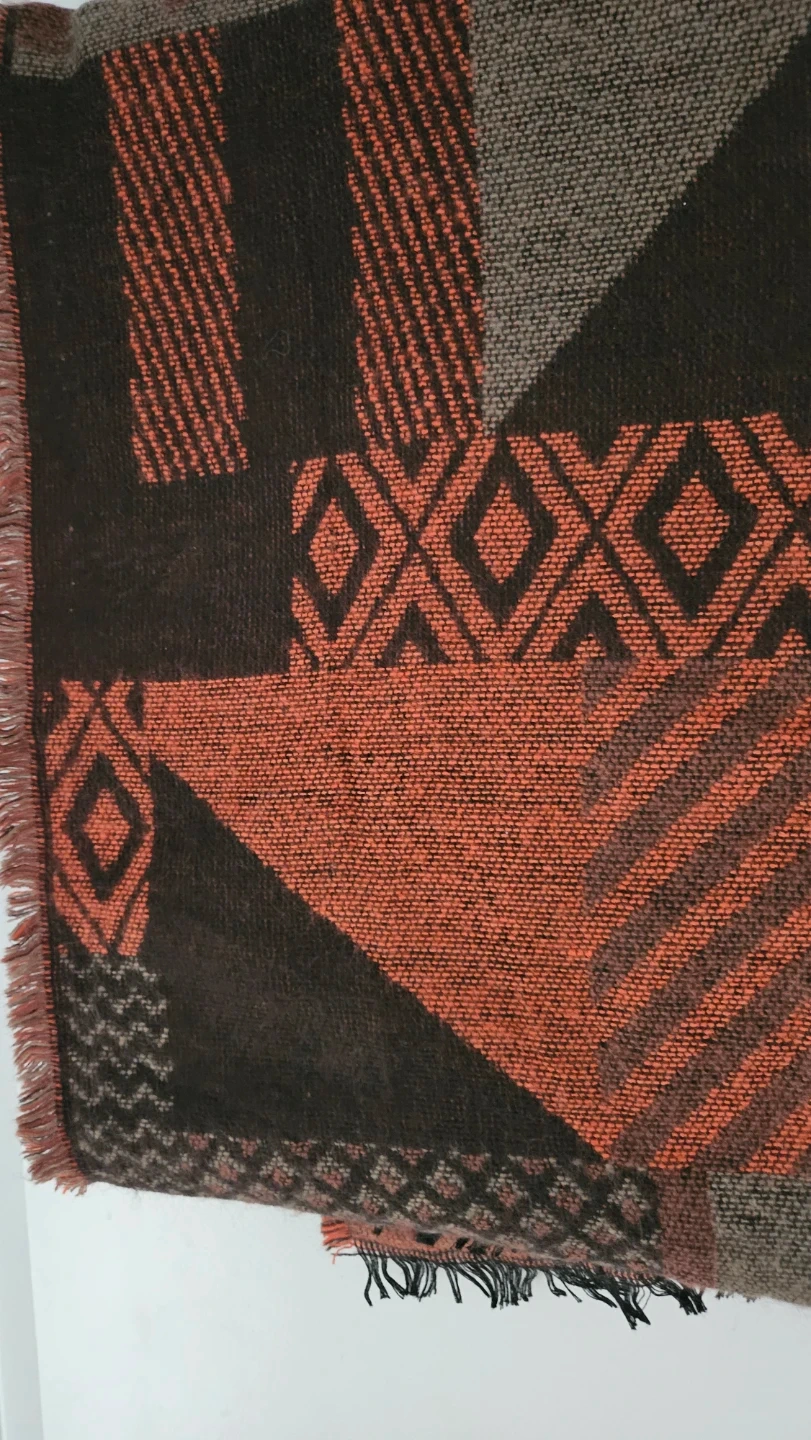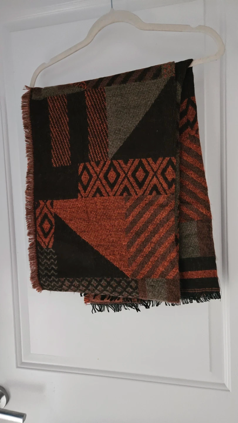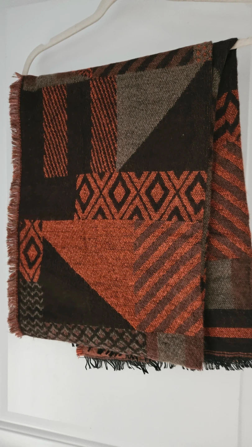 This scarf features a bold geometric pattern with burnt orange, brown, and olive green accents. It has fringed edges for a classic look. It's a cozy accessory for cooler weather!