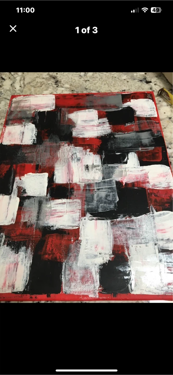 Selling an abstract painting featuring a striking combination of red, black, and white. The dimensions are approximately 14 inches by 11 inches. It's a unique piece to add some character to your space!