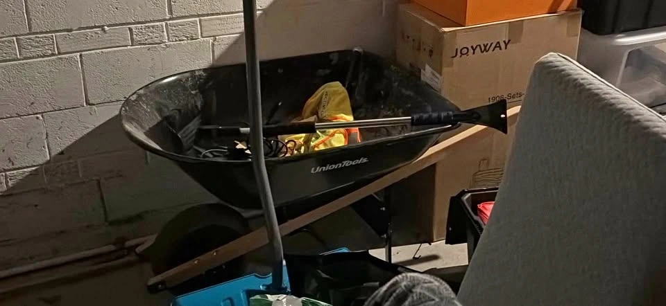 Sturdy UnionTools wheelbarrow with a black poly tray and wooden handles. This heavy-duty garden tool features a single front wheel and metal frame support.