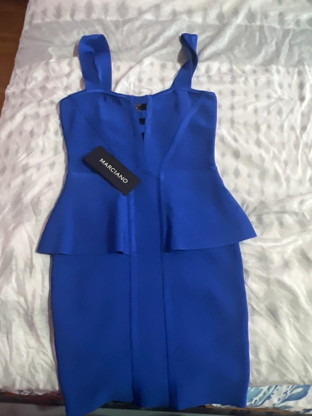 A royal blue Guess Marciano bandage dress with a peplum waist. It features a sweetheart neckline with strap details. This dress is a size XS never worn