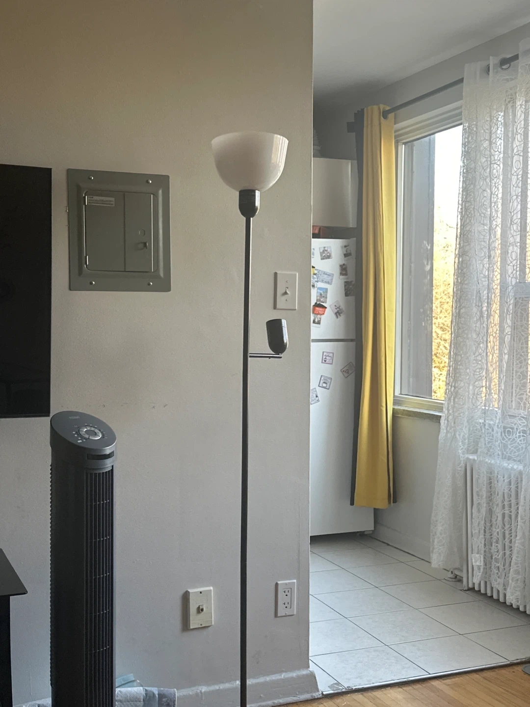 a floor lamp. It's in great condition and adds a modern touch to any room. The black finish is sleek and versatile, fitting well with various decor styles. Perfect for adding light and a small surface for your essentials beside your sofa or bed