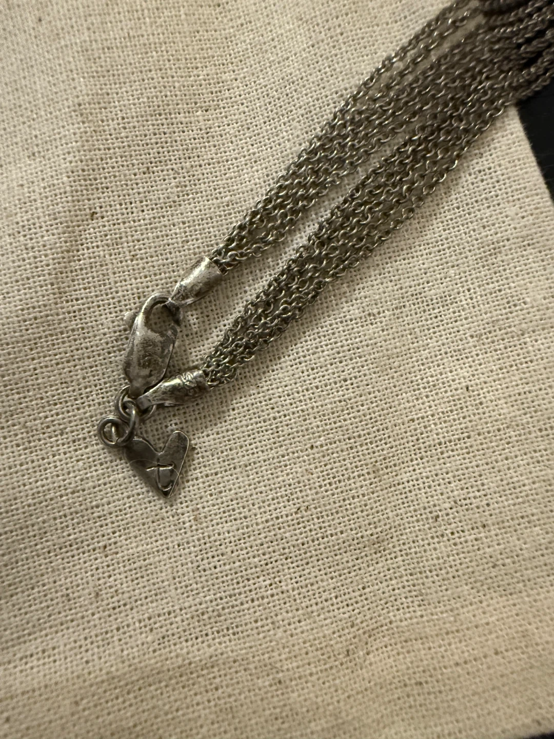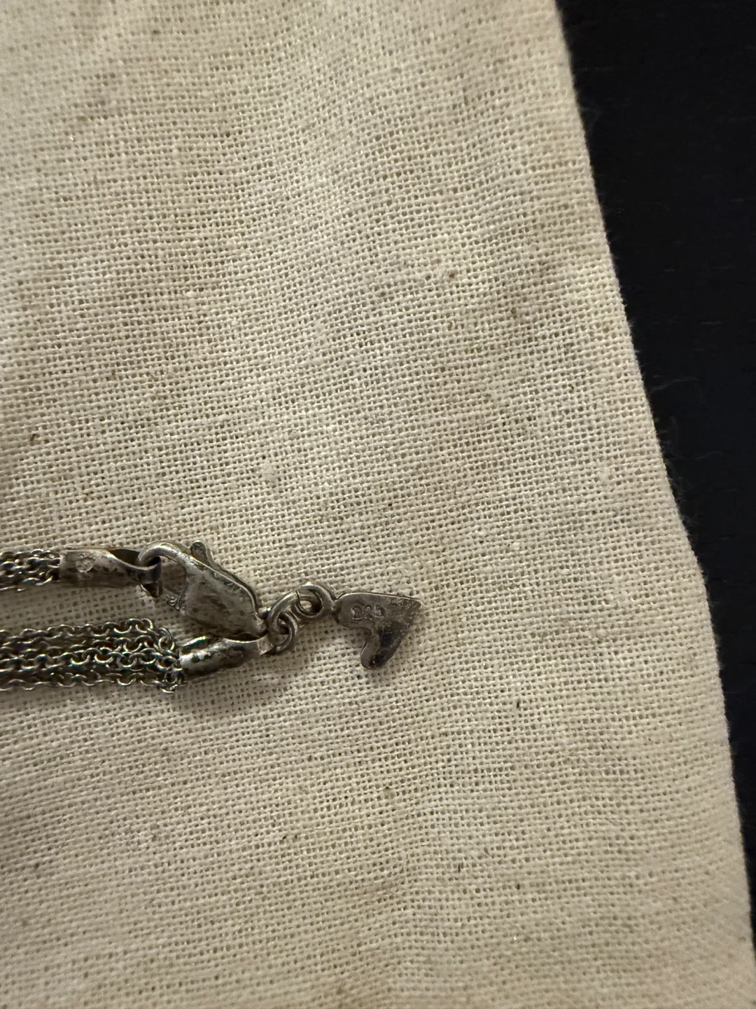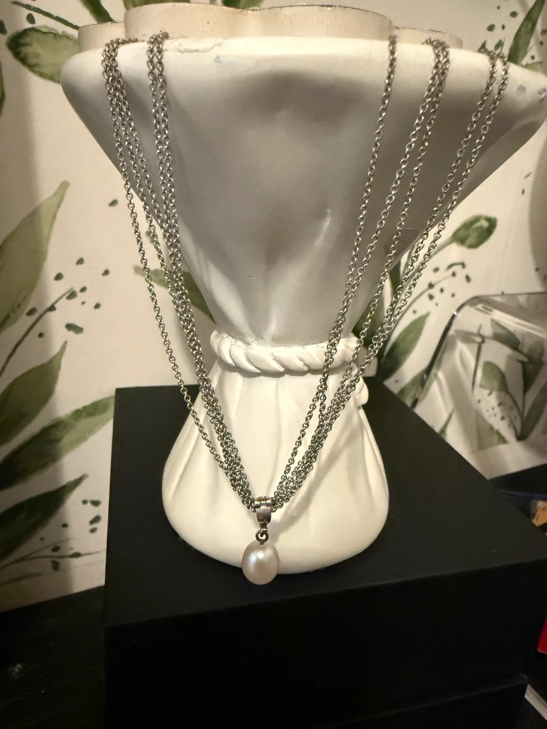 This necklace features multiple delicate silver chains layered together, culminating in a single pearl pendant. The clasp is a secure lobster claw style. Sterling silver.