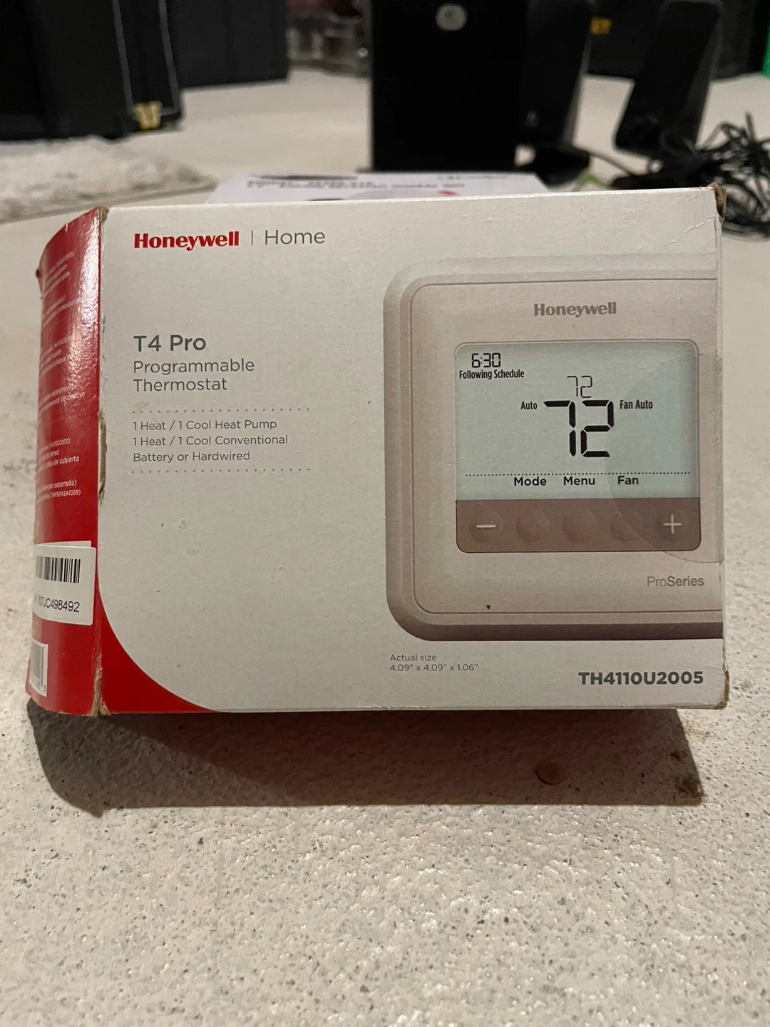 This is a Honeywell Home T4 Pro programmable thermostat. It's designed for 1 Heat / 1 Cool Heat Pump or 1 Heat / 1 Cool Conventional systems. Battery or hardwired installation is possible.