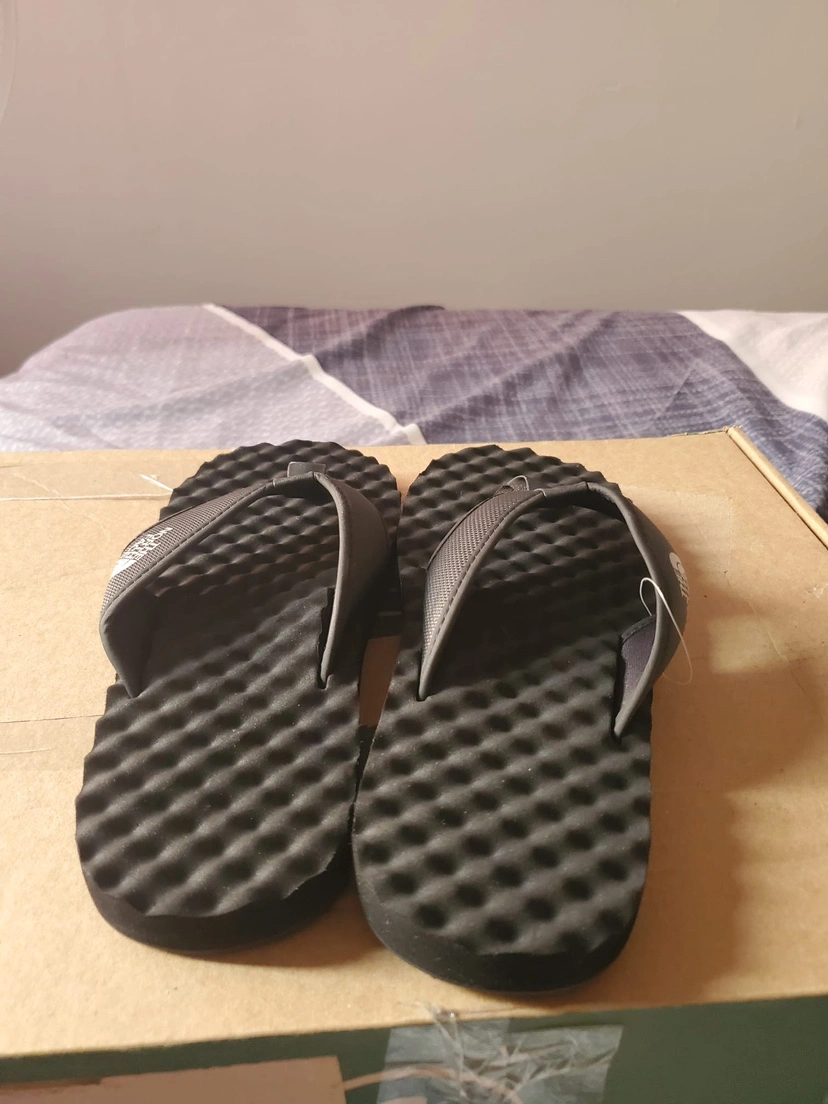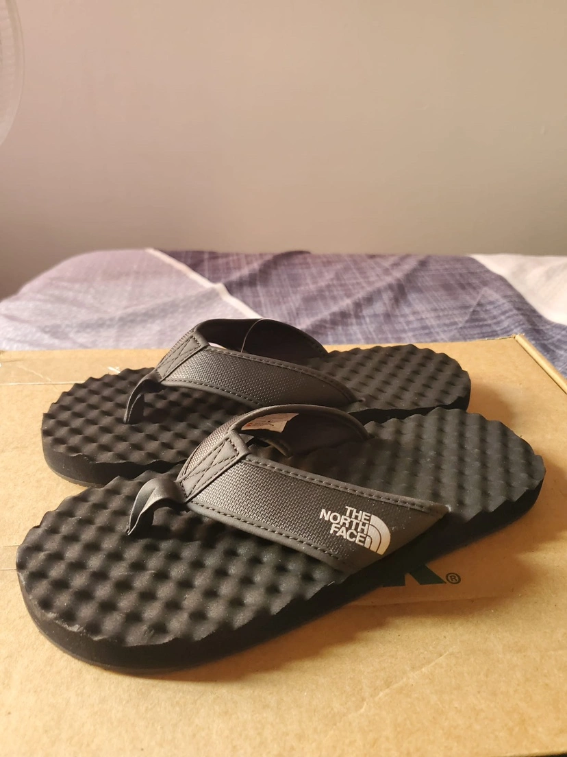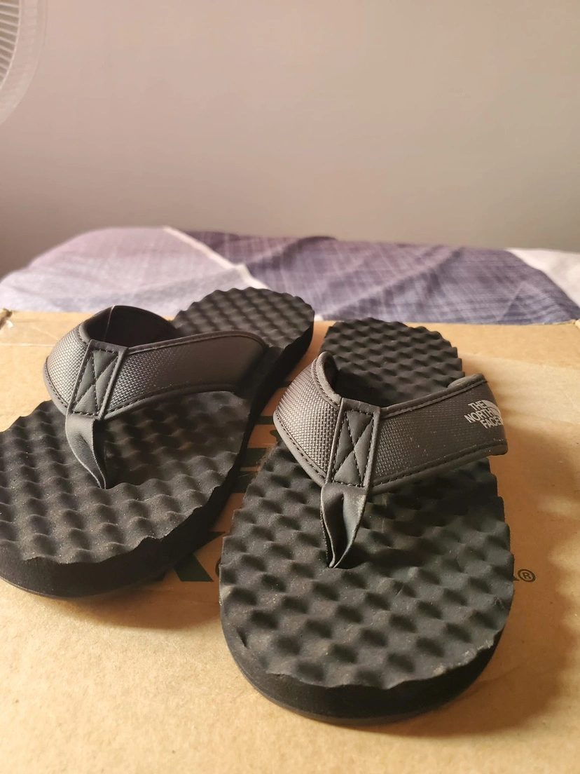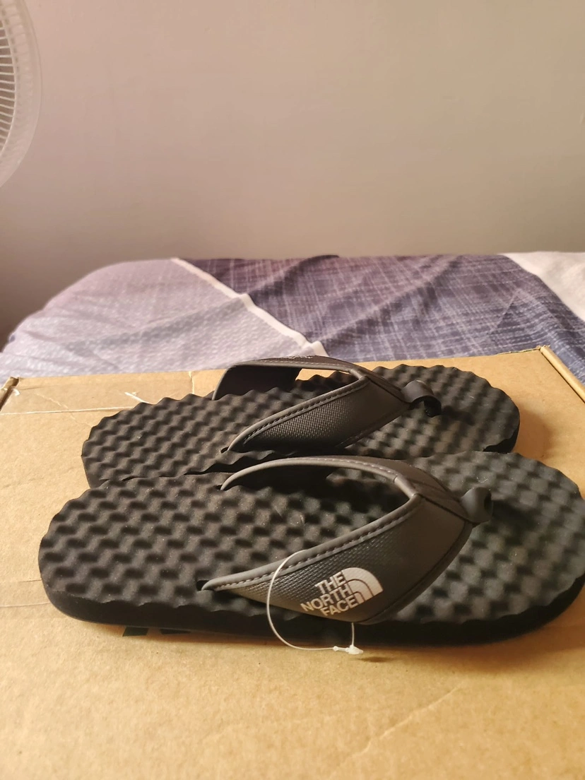 Black The North Face flip flops. These are comfortable and practical. They have a molded footbed and a textured sole that provides good traction. They are perfect for the beach, pool or just wearing around town. and they are a size 7