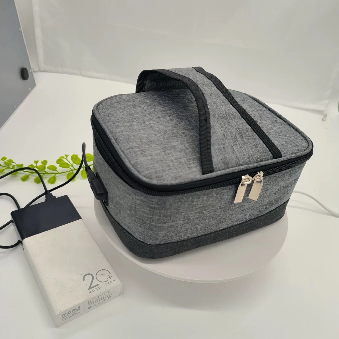 This is a grey insulated lunch bag that features USB heating. It's made of durable fabric with a sturdy handle and zippered closure. The bag is compact and portable, great for keeping your meals warm on the go.