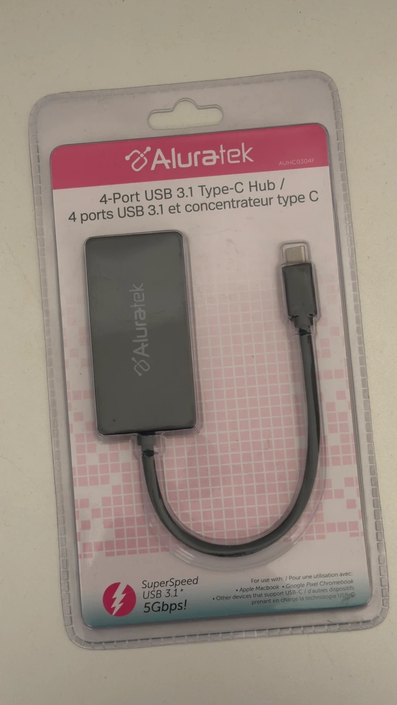 This Aluratek 4-port USB 3.1 Type-C hub adds more connectivity to your devices. It supports SuperSpeed USB 3.1 Gen 1 speeds, up to 5 Gbps. Plug-and-play functionality makes setup easy.