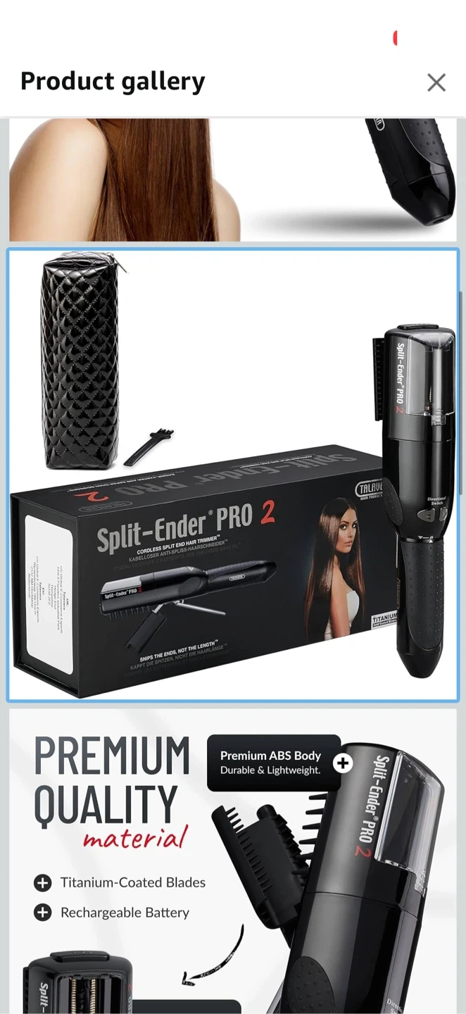 This Split-Ender PRO 2 trims split ends quickly and easily. It features titanium-coated blades and a rechargeable battery. Comes with a travel case. Helps keep your hair looking its best!