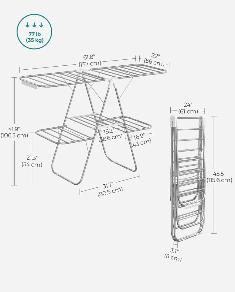 Brand new SONGMICS clothes drying rack, still new in the box. Perfect for air-drying clothes indoors or outdoors. This free-standing rack has a 2-level foldable design, height-adjustable wings, and plenty of space for clothes, towels, and socks. Folds flat for easy storage. Great for apartments, houses, or anyone who wants to save energy and keep clothes in great condition.