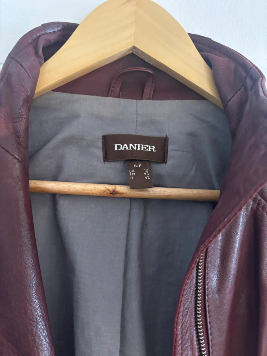 This is a DANIER leather jacket. It's a size Small.The jacket is made of mauve Color leather with a grey lining.
