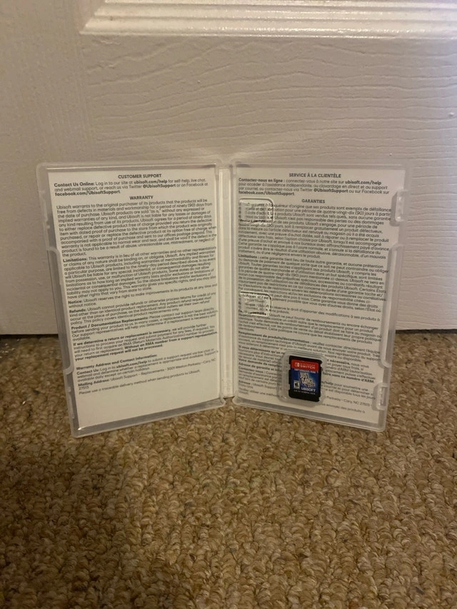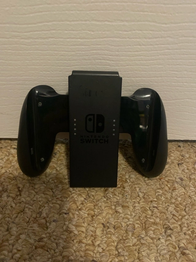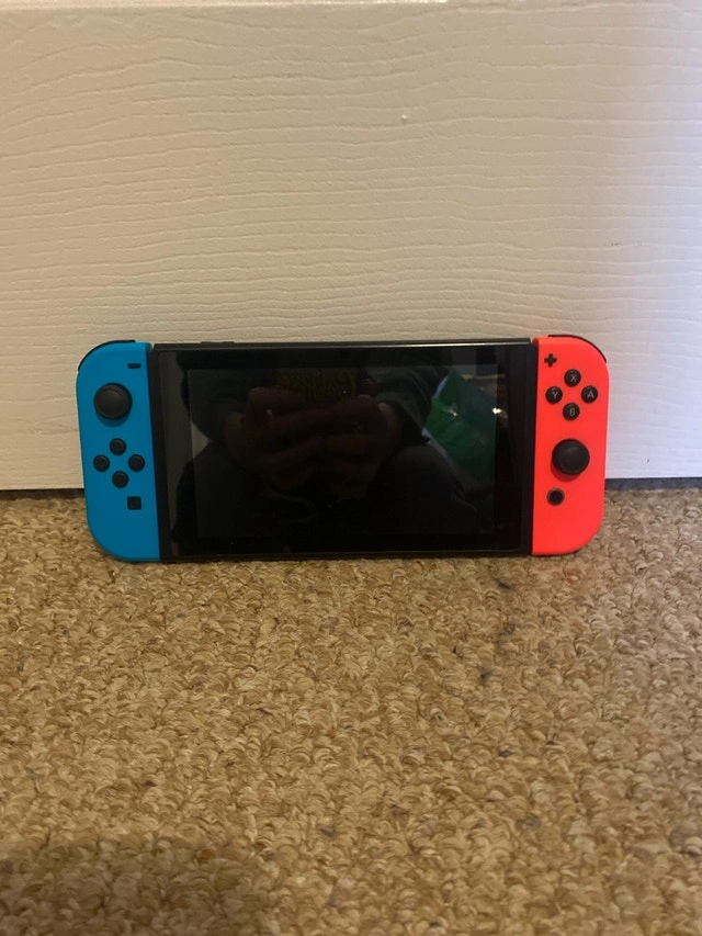 Nintendo Switch console with Joy-Cons, Dock, Joy-Con grip, original AC and HDMI cords. Includes Just Dance 2022. There are little scratches on the screen, and the right Joy-Con slides out easily. Cash and cashless payments are accepted. Available for curbside pickup.