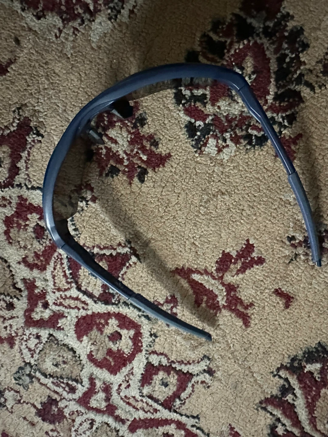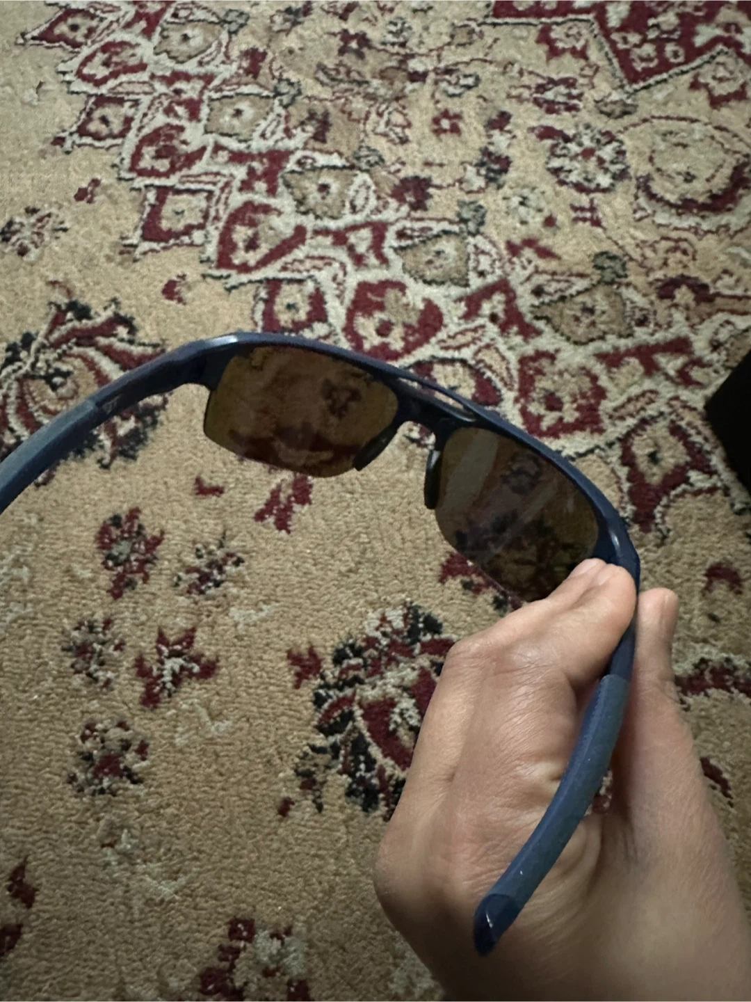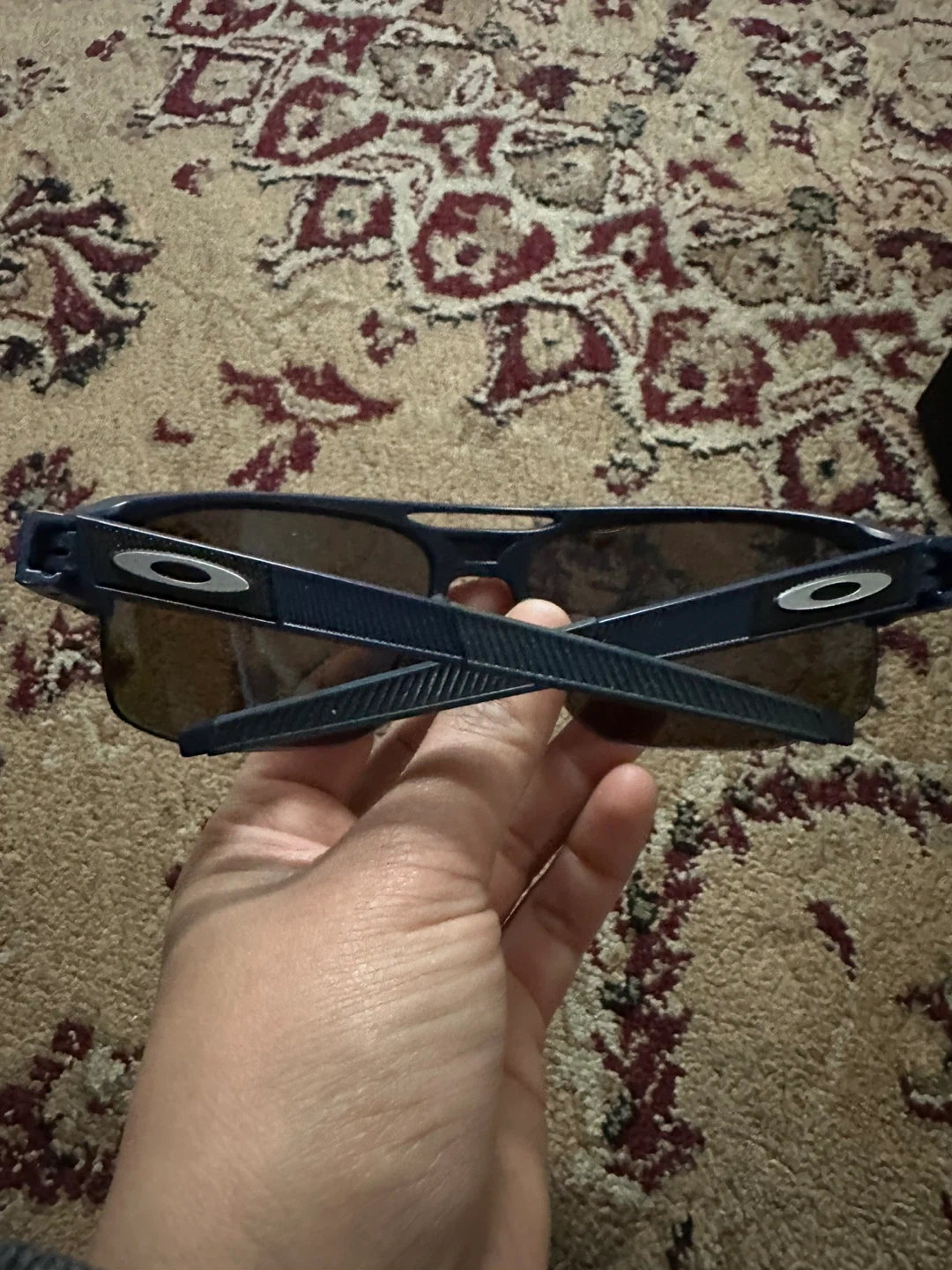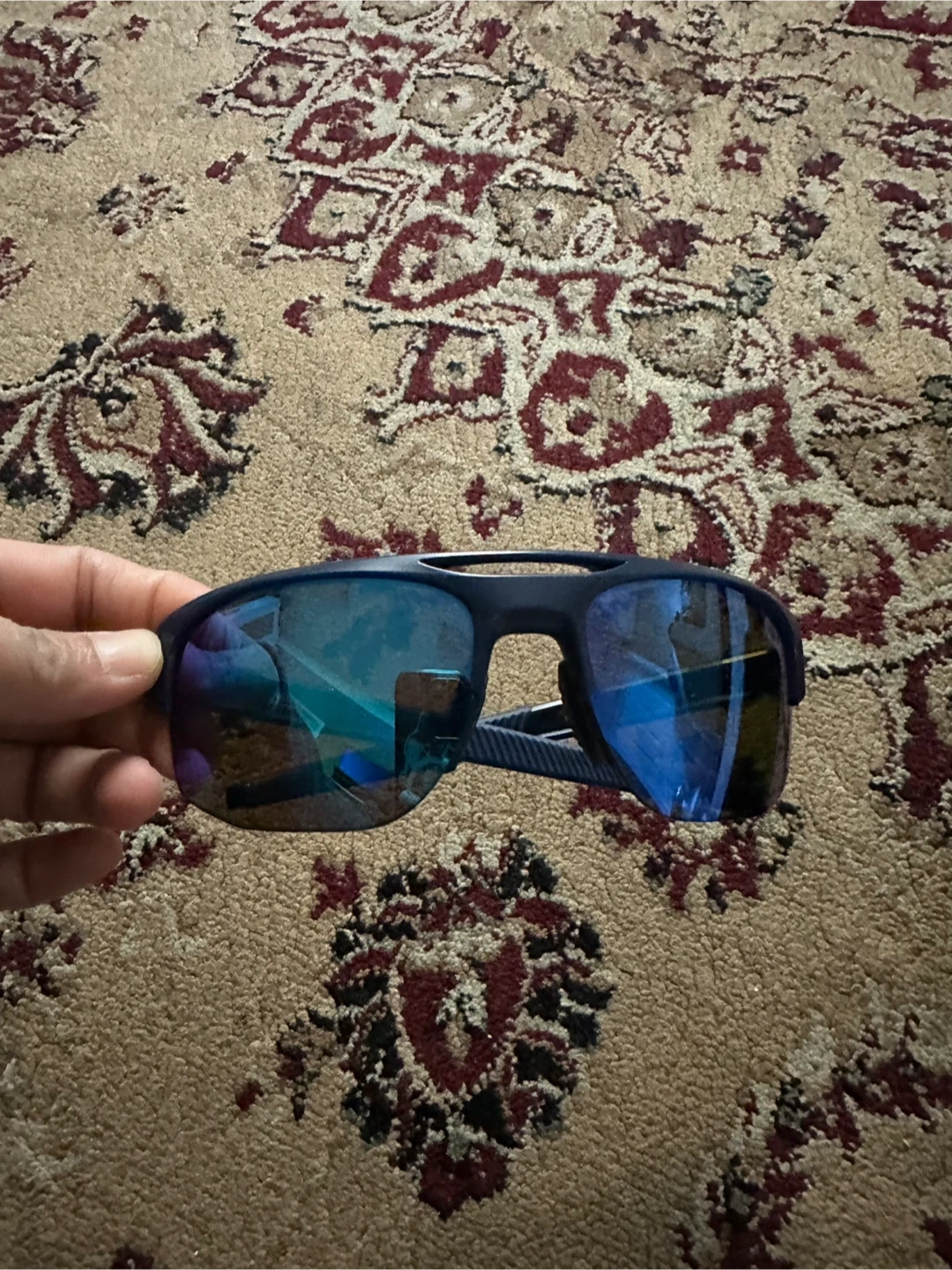 Blue Oakley sport sunglasses with brown lenses. They're lightweight and have a secure fit for active use. These are great for outdoor sports!